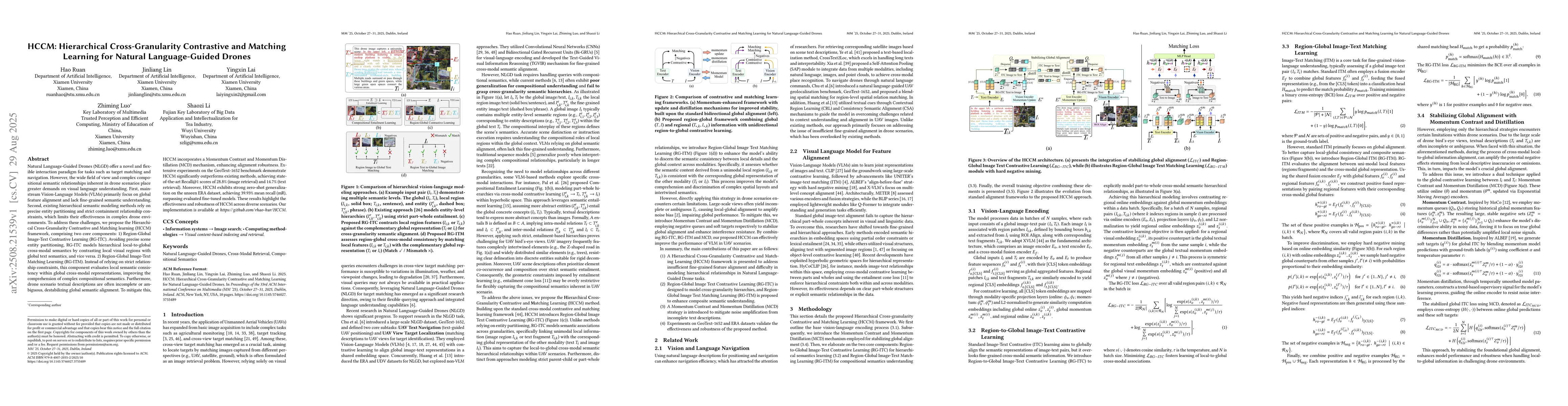 Natural Language-Guided Drones (NLGD) provide a novel paradigm for tasks such as target matching and navigation. However, the wide field of view and complex compositional semantics in drone scenarios pose challenges for vision-language understanding. Mainstream Vision-Language Models (VLMs) emphasize global alignment while lacking fine-grained semantics, and existing hierarchical methods depend on precise entity partitioning and strict containment, limiting effectiveness in dynamic environments. To address this, we propose the Hierarchical Cross-Granularity Contrastive and Matching learning (HCCM) framework with two components: (1) Region-Global Image-Text Contrastive Learning (RG-ITC), which avoids precise scene partitioning and captures hierarchical local-to-global semantics by contrasting local visual regions with global text and vice versa; (2) Region-Global Image-Text Matching (RG-ITM), which dispenses with rigid constraints and instead evaluates local semantic consistency within global cross-modal representations, enhancing compositional reasoning. Moreover, drone text descriptions are often incomplete or ambiguous, destabilizing alignment. HCCM introduces a Momentum Contrast and Distillation (MCD) mechanism to improve robustness. Experiments on GeoText-1652 show HCCM achieves state-of-the-art Recall@1 of 28.8% (image retrieval) and 14.7% (text retrieval). On the unseen ERA dataset, HCCM demonstrates strong zero-shot generalization with 39.93% mean recall (mR), outperforming fine-tuned baselines.