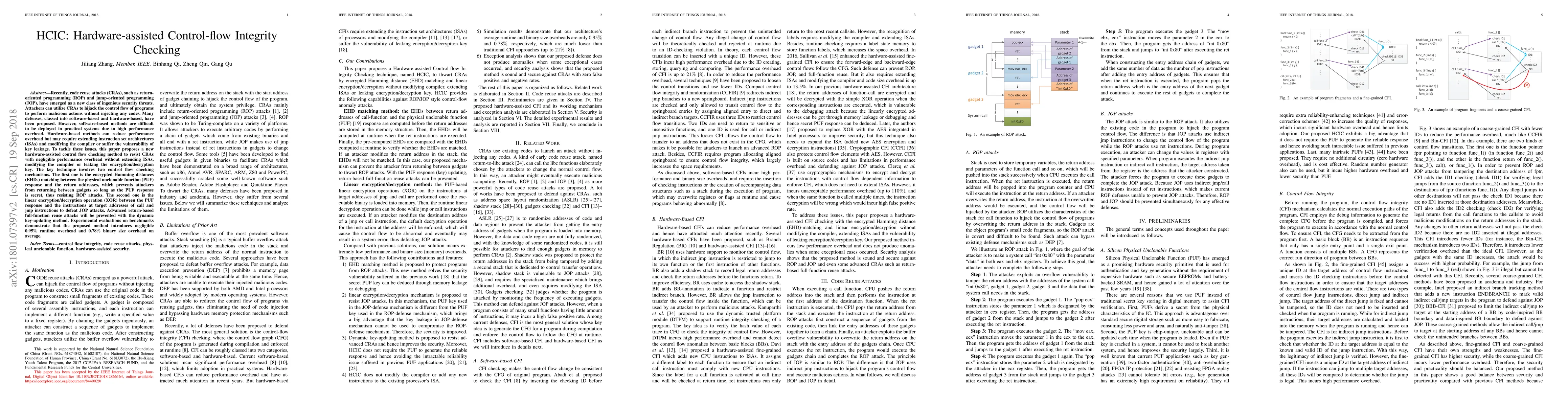 This paper proposes HCIC, a hardware-based control-flow integrity checking method to defend against code reuse attacks with minimal performance overhead. It uses encrypted Hamming distances and linear encryption/decryption operations to prevent ROP and JOP attacks without extending ISAs or modifying compilers.
