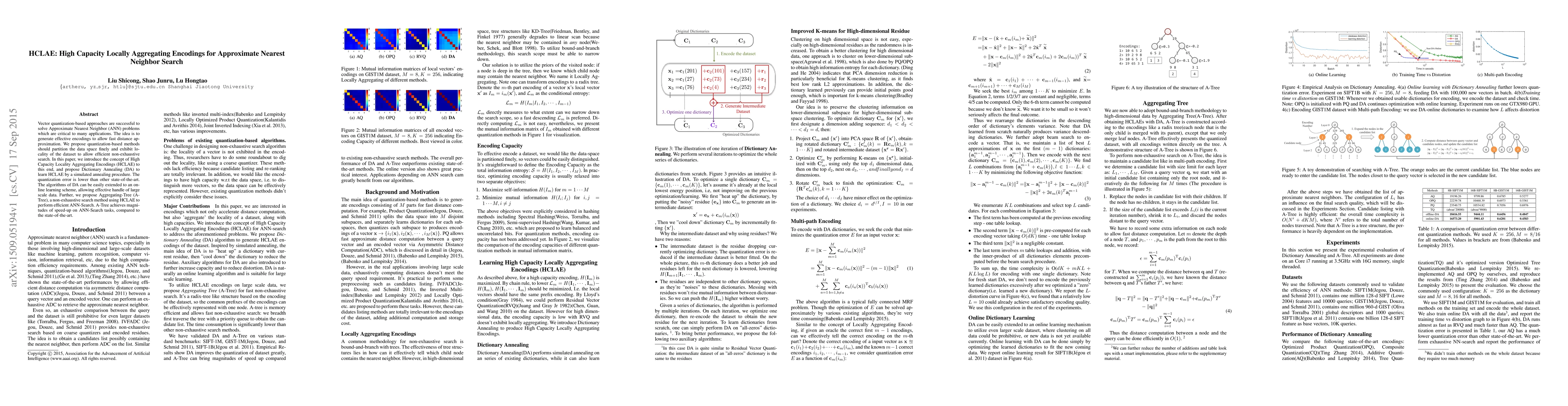 This paper introduces High Capacity Locality Aggregating Encodings (HCLAE) and Dictionary Annealing (DA) to improve Approximate Nearest Neighbor (ANN) search efficiency. The proposed method achieves lower quantization error and significantly speeds up ANN search using an Aggregating-Tree (A-Tree) approach.