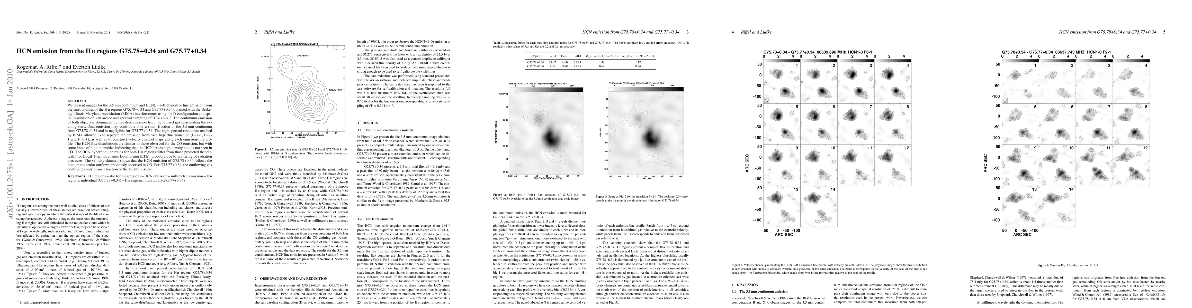 We present images for the 3.5 mm continuum and HCN(J=1-0) hyperfine line emission from the surroundings of the HII regions G75.78+0.34 and G75.77+0.34 obtained with the Berkeley Illinois Maryland Association (BIMA) interferometer using the D configuration at a spatial resolution of 18 arcsec and spectral sampling of 0.34 km/s. The continuum emission of both objects is dominated by free-free emission from the ionized gas surrounding the exciting stars. Dust emission may contribute only a small fraction of the 3.5 mm continuum from G75.78+0.34 and is negligible for G75.77+0.34. The high spectral resolution reached by BIMA allowed us to separate the emission from each hyperfine transition (F=1-1, F=2-1 and F=0-1), as well as to construct velocity channel maps along each emission-line profile. The HCN flux distributions are similar to those observed for the CO emission, but with some knots of high intensities indicating that the HCN traces high density clouds not seen in CO. The HCN hyperfine line ratios for both HII regions differ from those predicted theoretically for Local Thermodynamic Equilibrium (LTE), probably due to scattering of radiation processes. The velocity channels shows that the HCN emission of G75.78+0.34 follows the bipolar molecular outflows previously observed in CO. For G75.77+0.34, the outflowing gas contributes only a small fraction of the HCN emission.