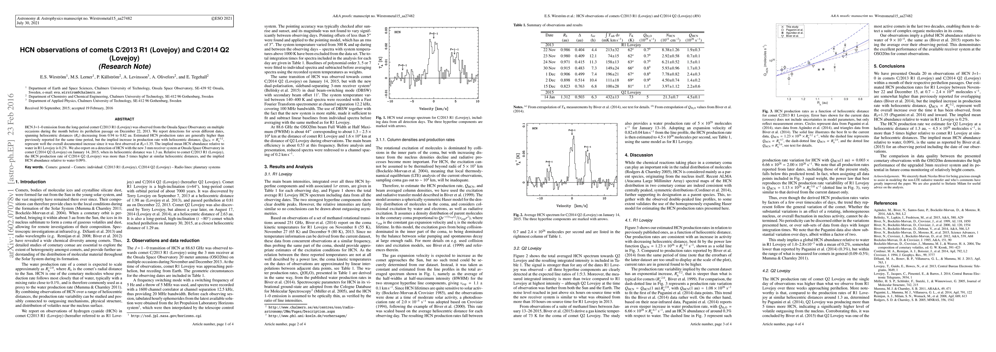 This study reports HCN J=1-0 emission observations from comets C/2013 R1 and C/2014 Q2 (both Lovejoy), revealing higher HCN production rates for C/2014 Q2 relative to C/2013 R1 despite similar heliocentric distances. The HCN abundance relative to water is estimated at 0.2% for C/2013 R1 and 0.09% for C/2014 Q2.