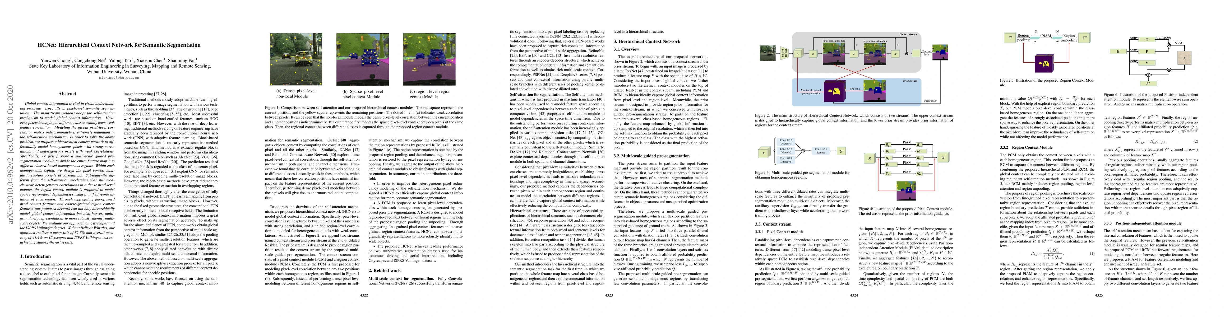 The HCNet proposes a hierarchical context network to enhance semantic segmentation by differentially modeling strong pixel correlations within homogeneous regions and sparse region-level dependencies for heterogeneous regions, achieving state-of-the-art mean IoU of 82.8% and overall accuracy of 91.4% on Cityscapes and ISPRS Vaihingen datasets.