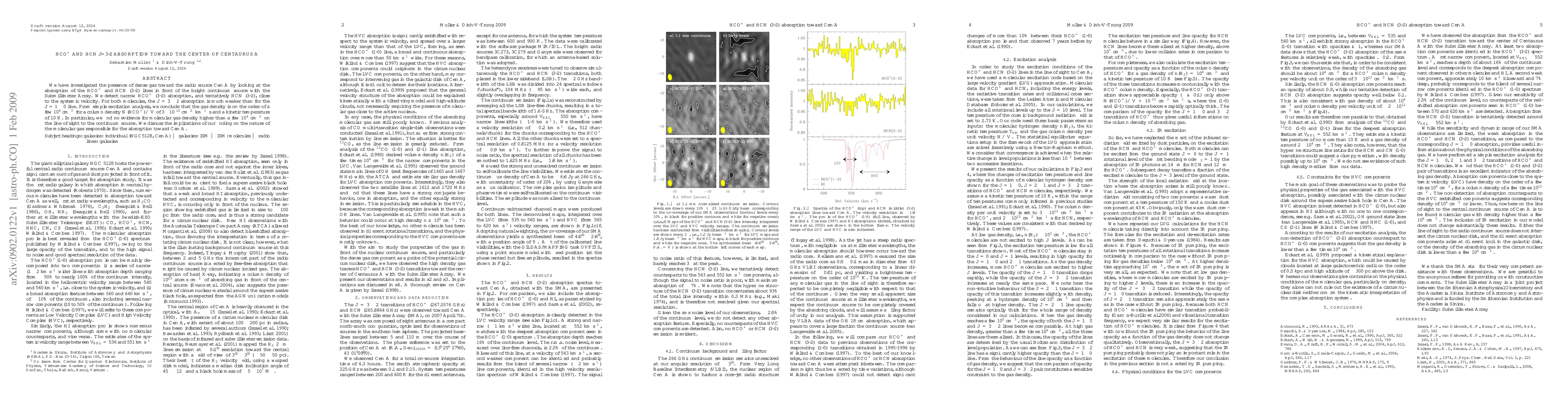We have investigated the presence of dense gas toward the radio source Cen A by looking at the absorption of the HCO+ and HCN (3-2) lines in front of the bright continuum source with the Submillimeter Array. We detect narrow HCO+ (3-2) absorption, and tentatively HCN (3-2), close to the systemic velocity. For both molecules, the J=3-2 absorption is much weaker than for the J=1-0 line. From simple excitation analysis, we conclude that the gas density is on the order of a few 10^4 cm^-3 for a column density N(HCO+)/dV of 3x10^12 cm^-2 km^-1 s and a kinetic temperature of 10 K. In particular, we find no evidence for molecular gas density higher than a few 10^4 cm^-3 on the line of sight to the continuum source. We discuss the implications of our finding on the nature of the molecular gas responsible for the absorption toward Cen A.