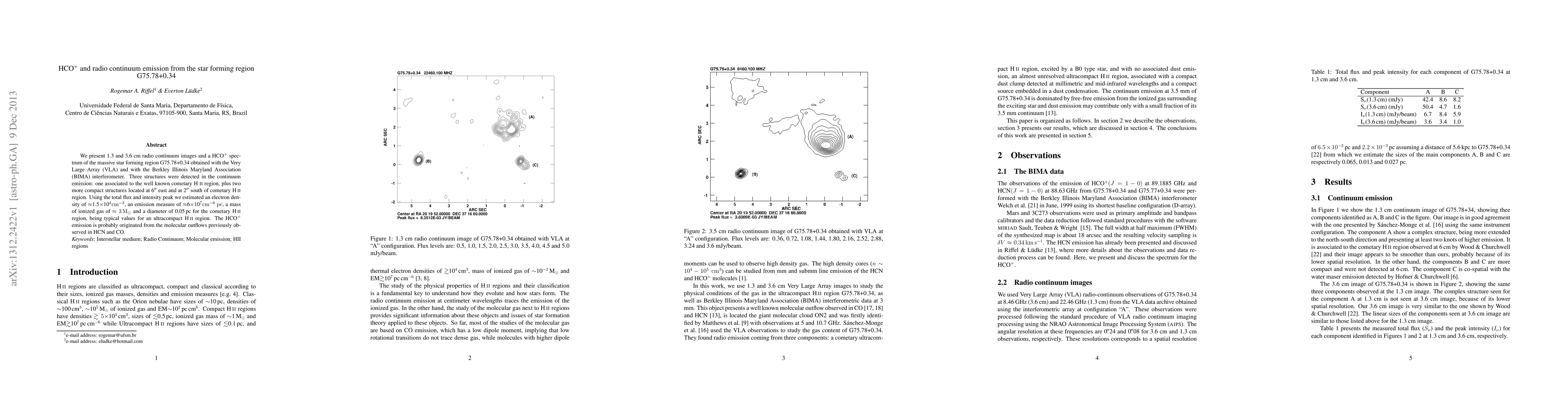 Researchers detected three radio continuum structures in a star-forming region, including an ultracompact HII region with a mass of ~3 M_Sun, and attributed the HCO+ emission to molecular outflows observed previously.