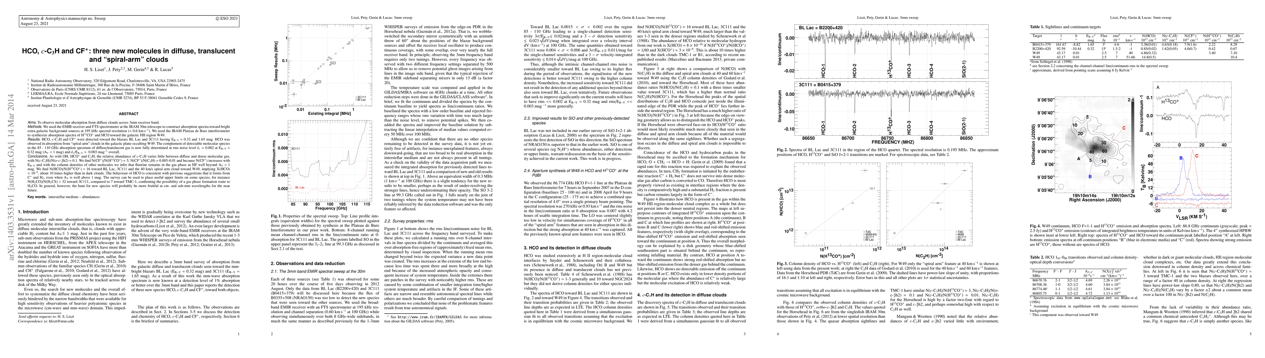 Researchers detected three new molecules (HCO, c-C3H, and CF+) in diffuse, translucent, and spiral-arm clouds using advanced spectroscopic techniques. The findings provide insights into the formation of these molecules and their abundance in various types of gas.
