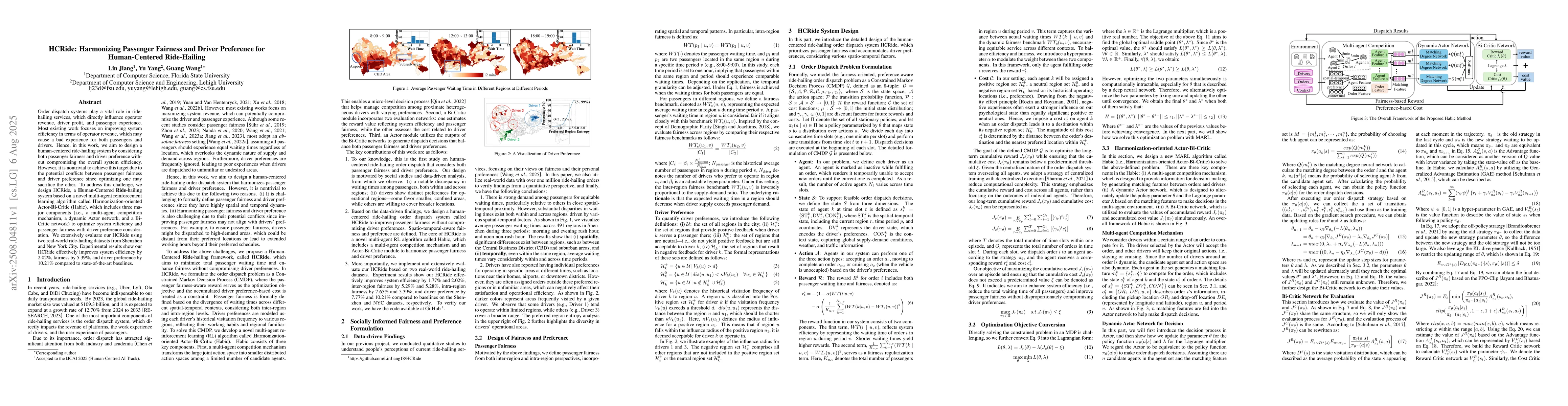 Order dispatch systems play a vital role in ride-hailing services, which directly influence operator revenue, driver profit, and passenger experience. Most existing work focuses on improving system efficiency in terms of operator revenue, which may cause a bad experience for both passengers and drivers. Hence, in this work, we aim to design a human-centered ride-hailing system by considering both passenger fairness and driver preference without compromising the overall system efficiency. However, it is nontrivial to achieve this target due to the potential conflicts between passenger fairness and driver preference since optimizing one may sacrifice the other. To address this challenge, we design HCRide, a Human-Centered Ride-hailing system based on a novel multi-agent reinforcement learning algorithm called Harmonization-oriented Actor-Bi-Critic (Habic), which includes three major components (i.e., a multi-agent competition mechanism, a dynamic Actor network, and a Bi-Critic network) to optimize system efficiency and passenger fairness with driver preference consideration. We extensively evaluate our HCRide using two real-world ride-hailing datasets from Shenzhen and New York City. Experimental results show our HCRide effectively improves system efficiency by 2.02%, fairness by 5.39%, and driver preference by 10.21% compared to state-of-the-art baselines.