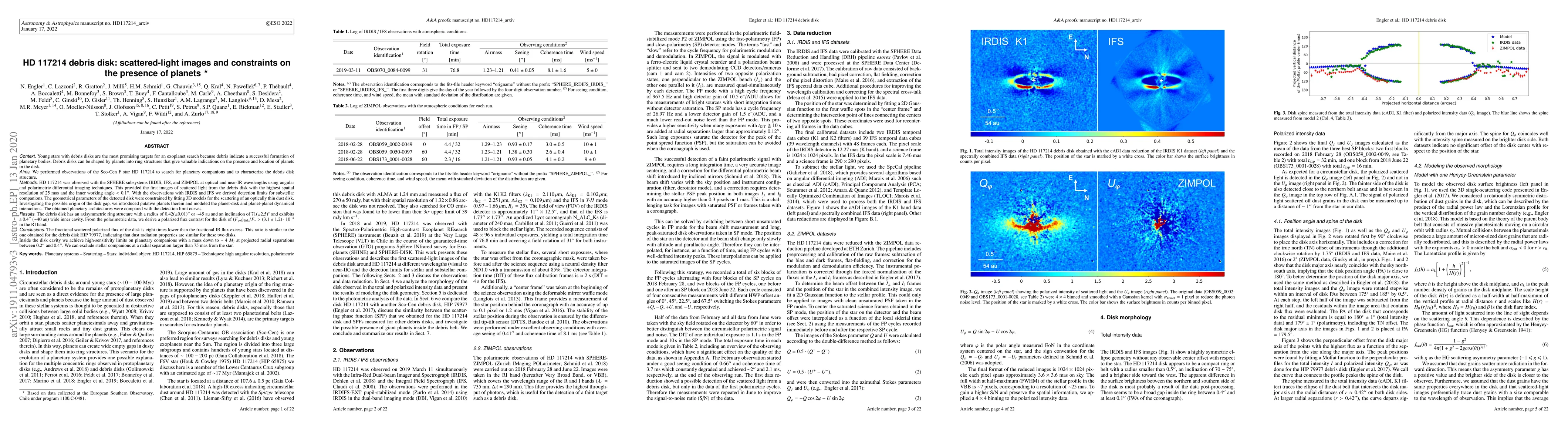 We performed observations of the Sco-Cen F star HD 117214 aiming at a search for planetary companions and the characterization of the debris disk structure. HD 117214 was observed with the SPHERE subsystems IRDIS, IFS and ZIMPOL at optical and near-IR wavelengths using angular and polarimetric differential imaging techniques. This provided the first images of scattered light from the debris disk with a spatial resolution reaching 25 mas and an inner working angle $< 0.1''$. With the observations with IRDIS and IFS we derive detection limits for substellar companions. The geometrical parameters of the detected disk are constrained by fitting 3D models for the scattering of an optically thin dust disk. Investigating the possible origin of the disk gap, we introduced putative planets therein and modeled the planet-disk and planet-planet dynamical interactions. The obtained planetary architectures are compared with the detection limit curves. The debris disk has an axisymmetric ring structure with a radius of $0.42(\pm 0.01)''$ or $\sim45$ au and an inclination of $71(\pm 2.5)^\circ$ and exhibits a $0.4''$ ($\sim40$ au) wide inner cavity. From the polarimetric data, we derive a polarized flux contrast for the disk of $(F_{\rm pol})_{\rm disk}/F_{\rm \ast}> (3.1 \pm 1.2)\cdot 10^{-4}$ in the RI band. The fractional scattered polarized flux of the disk is eight times smaller than the fractional infrared flux excess. This ratio is similar to the one obtained for the debris disk HIP 79977 indicating that dust radiation properties are not very different between these two disks. Inside the disk cavity we achieve the high sensitivity limits on planetary companions with a mass down to $\sim 4 M_{\rm J}$ at projected radial separations between $0.2''$ and $0.4''$. We can exclude the stellar companions at a radial separation larger than 75 mas from the star.
