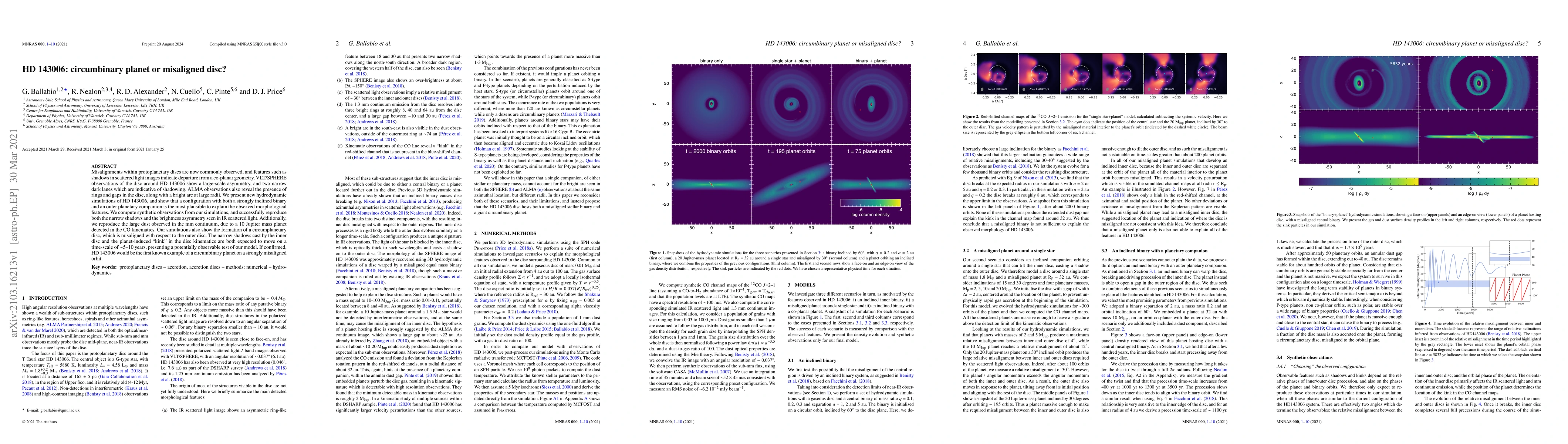 New hydrodynamic simulations suggest HD 143006's disc features are due to a misaligned binary and a planetary companion, reproducing observed shadows, asymmetry, rings, and a bright arc. A 10 Jupiter mass planet is detected, causing a circumplanetary disc misaligned with the outer disc, with features expected to change observables over 5-10 years, potentially identifying HD 143006 as the first known circumbinary planet on a strongly misaligned orbit.