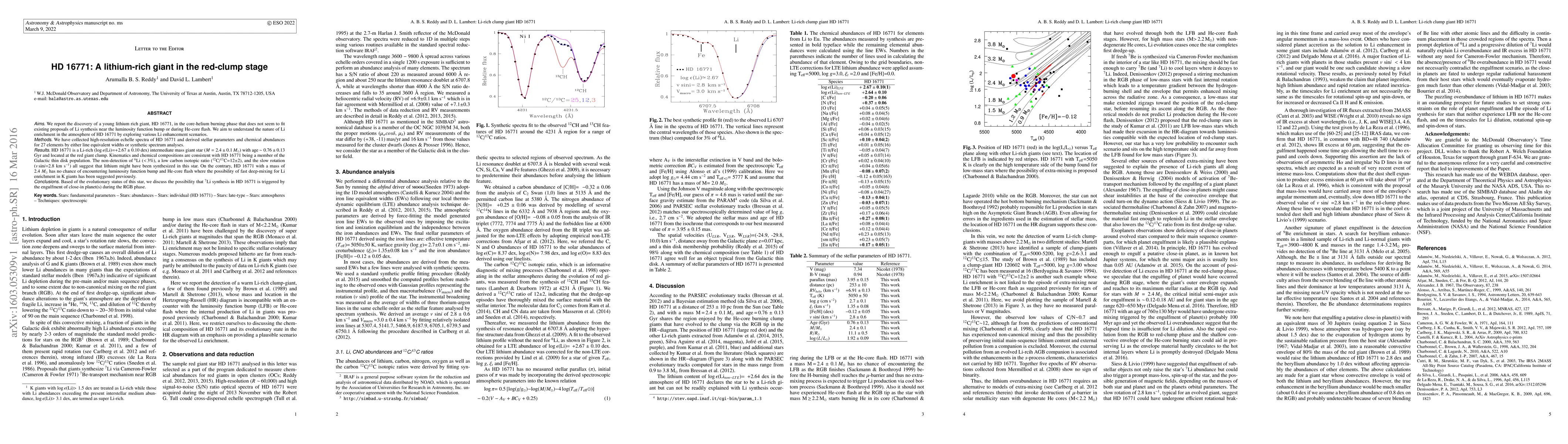 HD 16771 is a lithium-rich giant star in the red-clump phase, challenging existing theories of lithium enrichment. The star's lithium abundance suggests internal synthesis, possibly due to the engulfment of a close-in planet during its red giant branch phase.