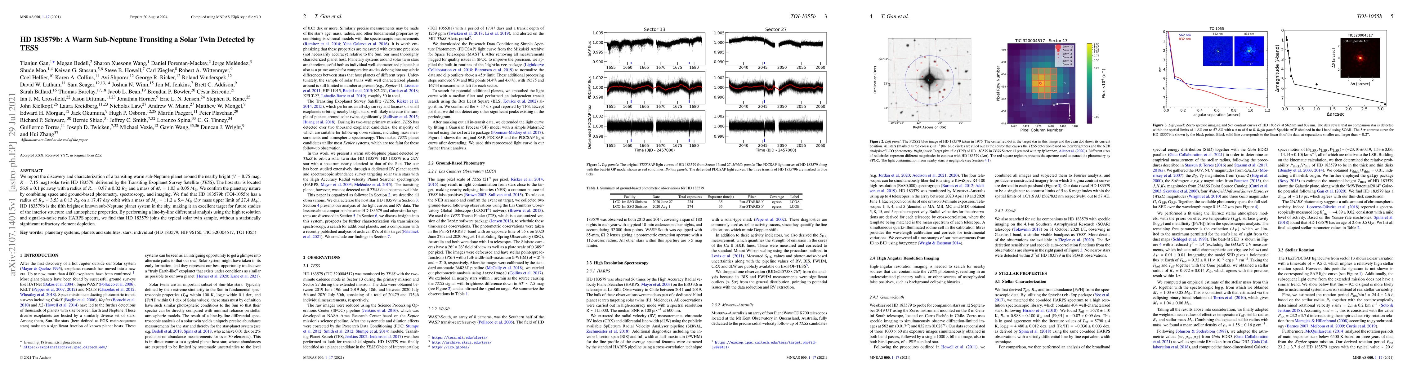 The TESS satellite discovered HD 183579b, a warm sub-Neptune transiting a solar twin star, characterized by a radius of 3.53 Earth radii and a 17.47-day orbit. The planet is part of an excellent system for future studies on its interior and atmosphere.