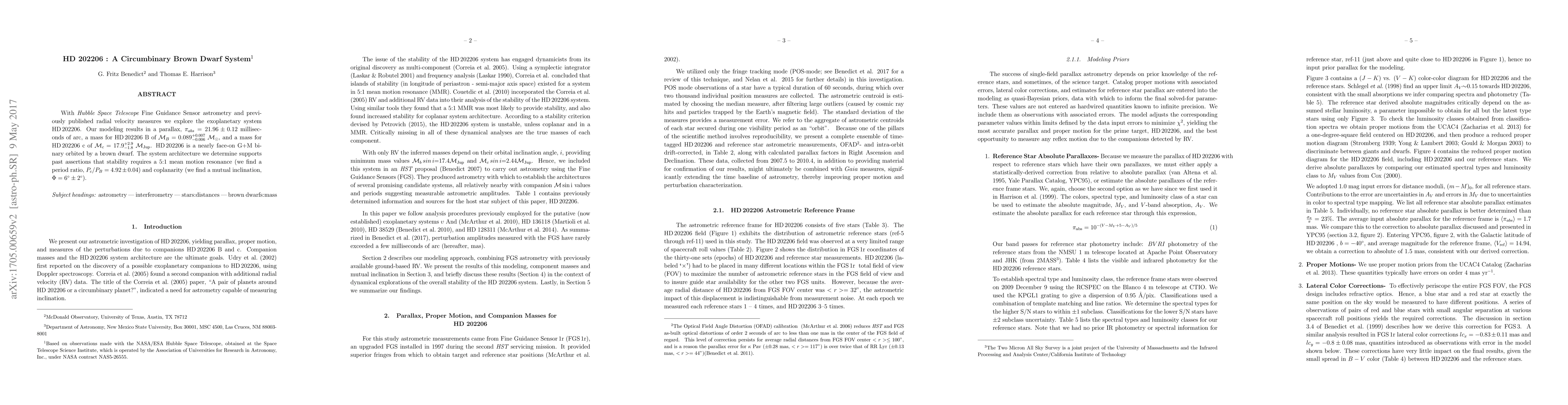 With Hubble Space Telescope Fine Guidance Sensor astrometry and previously published radial velocity measures we explore the exoplanetary system HD 202206. Our modeling results in a parallax, $\pi_{abs} = 21.96\pm0.12$ milliseconds of arc, a mass for HD 202206 B of M$_B = 0.089^{ +0.007}_{-0.006}$ Msun, and a mass for HD 202206 c of M$_c = 17.9 ^{ +2.9}_{-1.8}$ MJup. HD 202206 is a nearly face-on G+M binary orbited by a brown dwarf. The system architecture we determine supports past assertions that stability requires a 5:1 mean motion resonance (we find a period ratio, $P_c/P_B = 4.92\pm0.04$) and coplanarity (we find a mutual inclination, Phi = 6 \arcdeg \pm 2 \arcdeg).