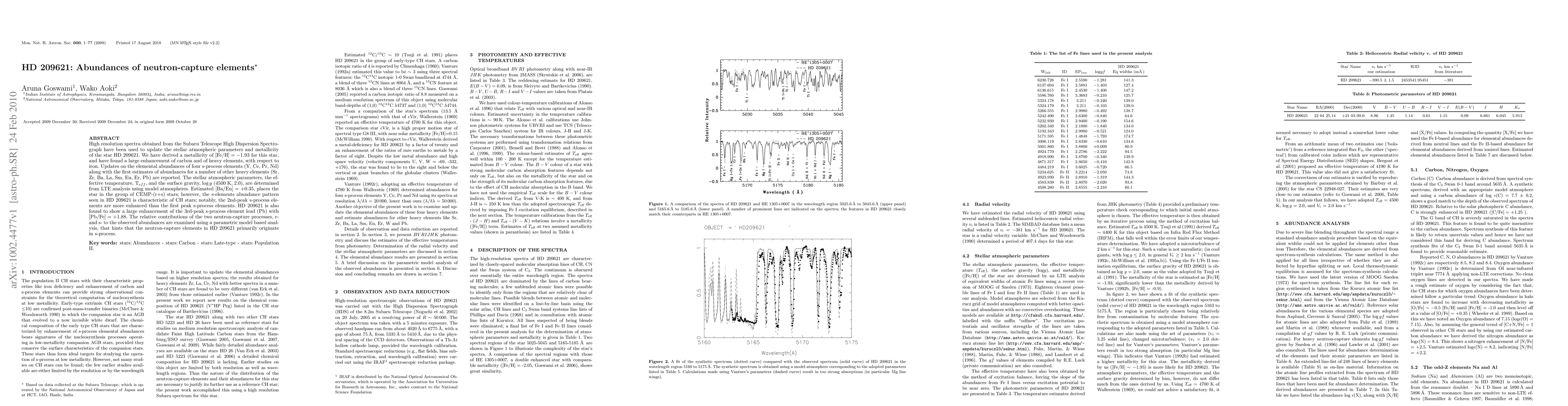HD 209621 exhibits a significant enhancement of neutron-capture elements, particularly s-process elements, with a metallicity of [Fe/H] = -1.93, placing it among CEMP-(r+s) stars. The star shows a distinct abundance pattern characteristic of CH stars, with the 2nd-peak s-process elements more prominent than the 1st-peak and a notable enhancement in lead.