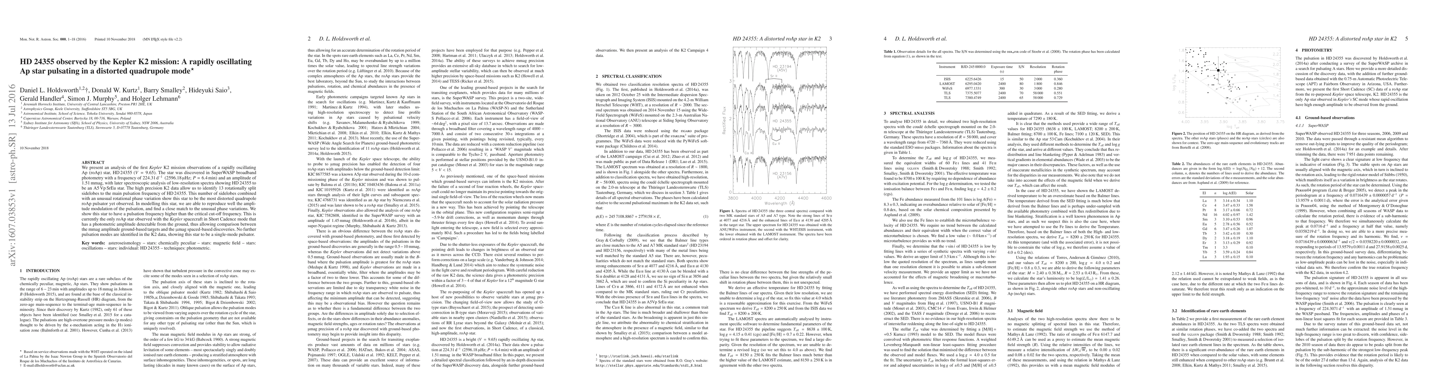 The Kepler K2 mission observed HD 24355, a rapidly oscillating Ap star pulsating in a distorted quadrupole mode, with 13 rotationally split sidelobes to its main frequency, indicating it is the most distorted quadrupole roAp pulsator observed. The star's pulsation frequency exceeds the critical cut-off frequency, making it unique among roAp stars observed by Kepler.