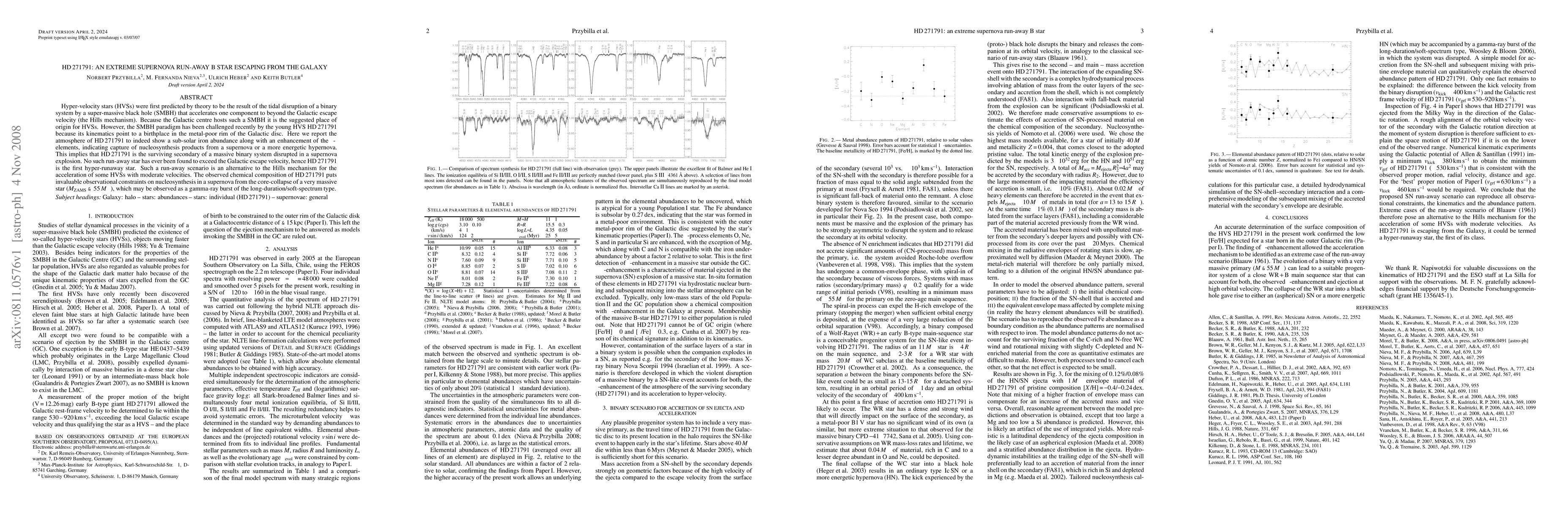 HD 271791 is identified as the first hyper-runaway star escaping the galaxy, likely formed from a supernova explosion in a massive binary system, challenging the SMBH acceleration mechanism for hyper-velocity stars. Its unique chemical composition provides insights into nucleosynthesis from the core-collapse of very massive stars.