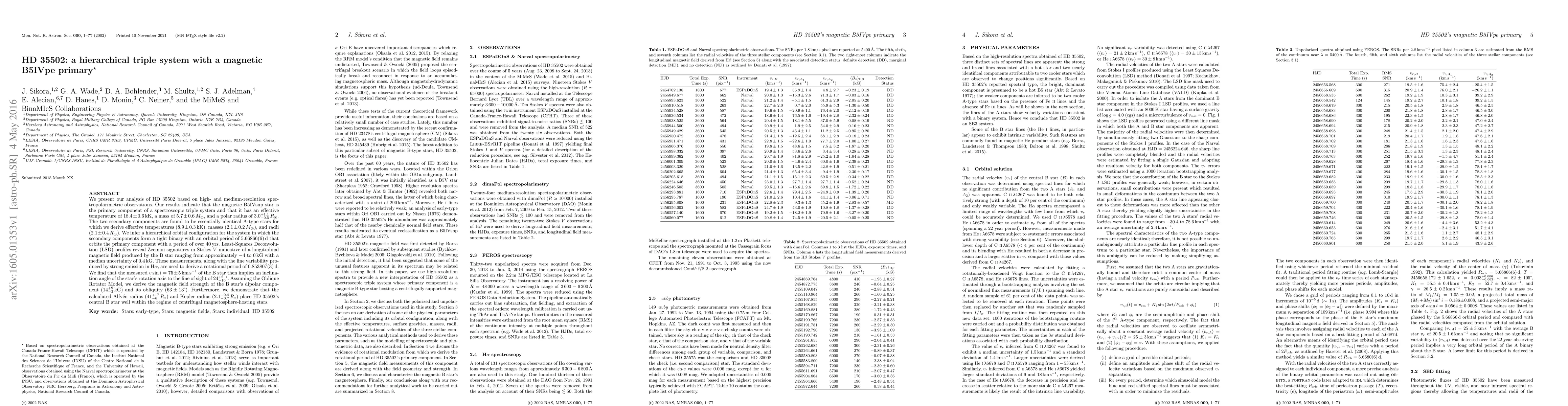 A hierarchical triple system with a magnetic B star is analyzed for its effective temperature, mass, radius, orbital periods, and rotation period, revealing details about the star's magnetic field and rotational properties.