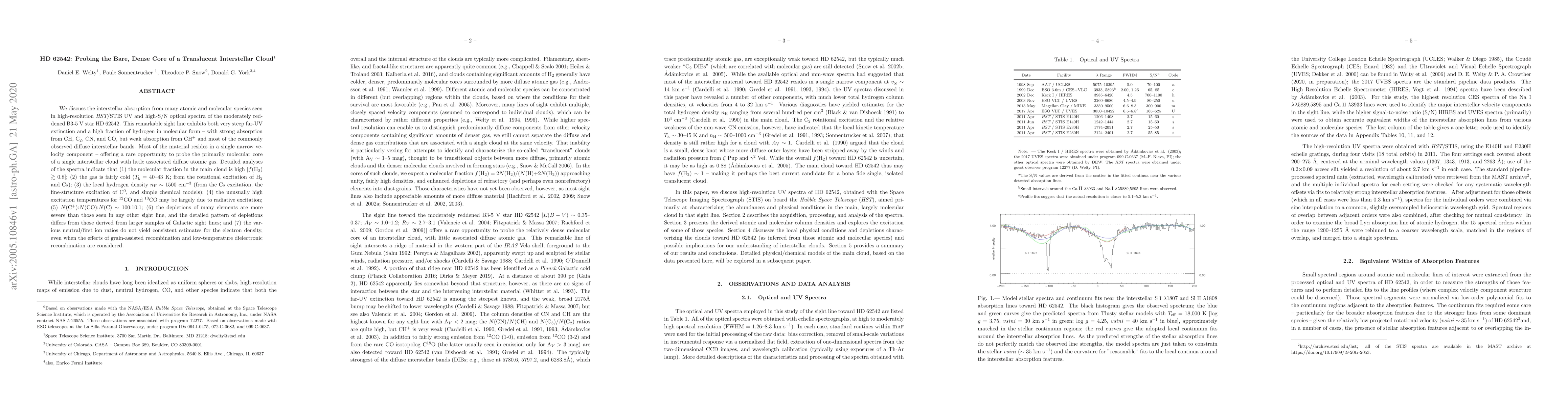 We discuss the interstellar absorption from many atomic and molecular species seen in high-resolution $HST$/STIS UV and high-S/N optical spectra of the moderately reddened B3-5~V star HD~62542. This remarkable sight line exhibits both very steep far-UV extinction and a high fraction of hydrogen in molecular form -- with strong absorption from CH, C$_2$, CN, and CO, but weak absorption from CH$^+$ and most of the commonly observed diffuse interstellar bands. Most of the material resides in a single narrow velocity component -- offering a rare opportunity to probe the primarily molecular core of a single interstellar cloud with little associated diffuse atomic gas. Detailed analyses of the spectra indicate that: (1) the molecular fraction in the main cloud is high [$f$(H$_2$) $>$ 0.8]; (2) the gas is fairly cold ($T_{\rm k}$ = 40--43 K, from the rotational excitation of H$_2$ and C$_2$); (3) the local hydrogen density $n_{\rm H}$ $\sim$ 1500 cm$^{-3}$ (from the C$_2$ excitation, the fine-structure excitation of C$^0$, and simple chemical models); (4) the unusually high excitation temperatures for $^{12}$CO and $^{13}$CO may be largely due to radiative excitation; (5) $N$(C$^+$):$N$(CO):$N$(C) $\sim$ 100:10:1; (6) the depletions of many elements are more severe than those seen in any other sight line, and the detailed pattern of depletions differs from those derived from larger samples of Galactic sight lines; and (7) the various neutral/first ion ratios do not yield consistent estimates for the electron density, even when the effects of grain-assisted recombination and low-temperaure dielectronic recombination are considered.
