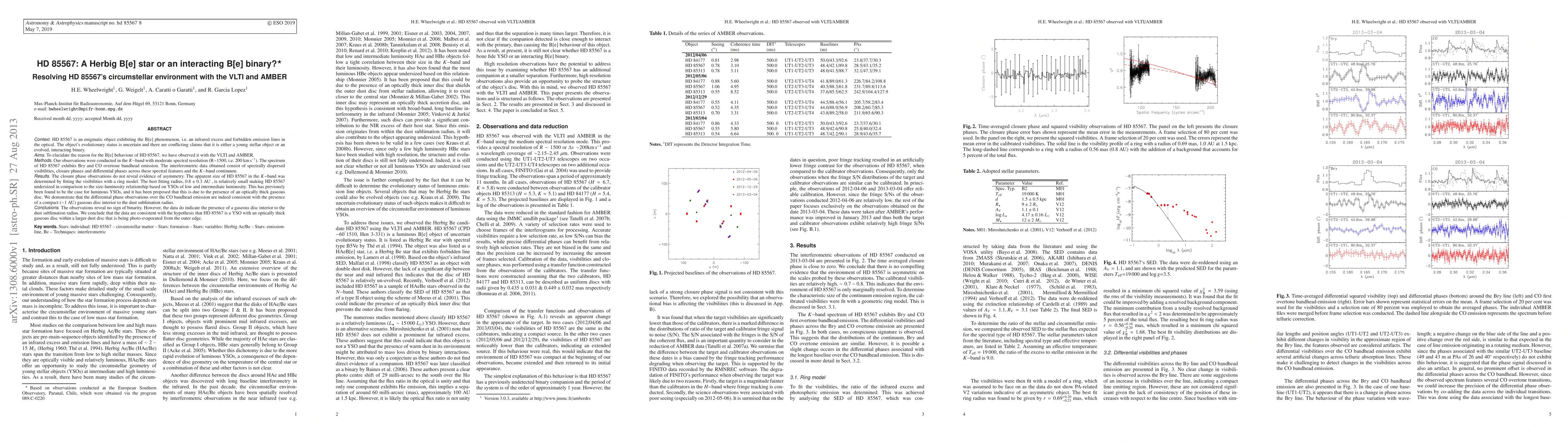 Context. HD 85567 is an enigmatic object exhibiting the B[e] phenomenon, i.e. an infrared excess and forbidden emission lines in the optical. The object's evolutionary status is uncertain and there are conflicting claims that it is either a young stellar object or an evolved, interacting binary. Aims. To elucidate the reason for the B[e] behaviour of HD 85567, we have observed it with the VLTI and AMBER. Methods. Our observations were conducted in the K-band with moderate spectral resolution (R~1500, i.e. 200 km/s). The spectrum of HD 85567 exhibits Br gamma and CO overtone bandhead emission. The interferometric data obtained consist of spectrally dispersed visibilities, closure phases and differential phases across these spectral features and the K-band continuum. Results. The closure phase observations do not reveal evidence of asymmetry. The apparent size of HD 85567 in the K-band was determined by fitting the visibilities with a ring model. The best fitting radius, 0.8 +/- 0.3 AU, is relatively small making HD 85567 undersized in comparison to the size-luminosity relationship based on YSOs of low and intermediate luminosity. This has previously been found to be the case for luminous YSOs, and it has been proposed that this is due to the presence of an optically thick gaseous disc. We demonstrate that the differential phase observations over the CO bandhead emission are indeed consistent with the presence of a compact (~1 AU) gaseous disc interior to the dust sublimation radius. Conclusions. The observations reveal no sign of binarity. However, the data do indicate the presence of a gaseous disc interior to the dust sublimation radius. We conclude that the data are consistent with the hypothesis that HD 85567 is a YSO with an optically thick gaseous disc within a larger dust disc that is being photo-evaporated from the outer edge.