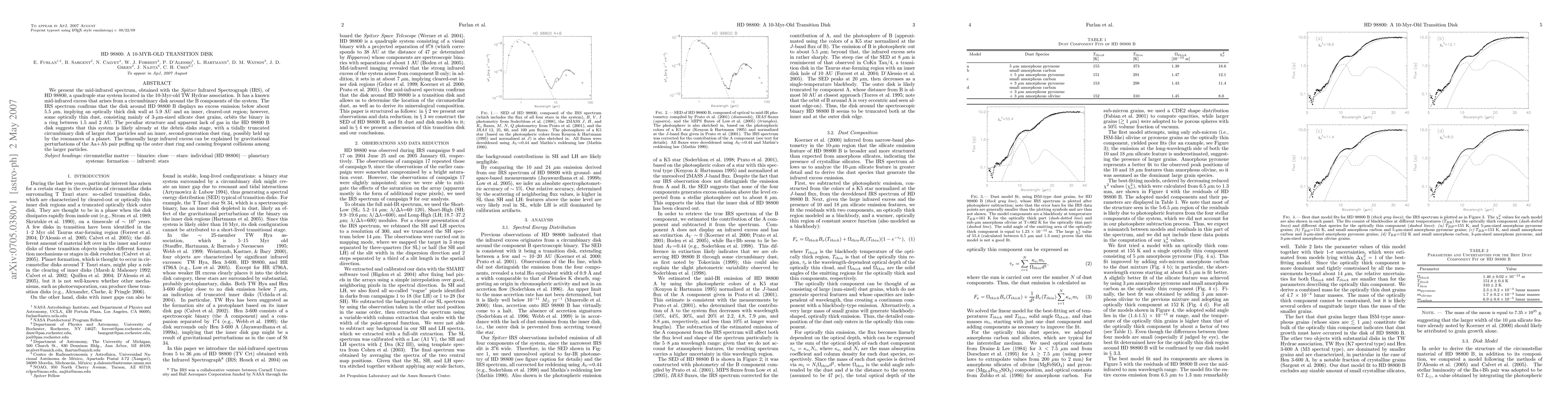 We present the mid-infrared spectrum, obtained with the Spitzer Infrared Spectrograph (IRS), of HD 98800, a quadruple star system located in the 10-Myr-old TW Hydrae association. It has a known mid-infrared excess that arises from a circumbinary disk around the B components of the system. The IRS spectrum confirms that the disk around HD 98800 B displays no excess emission below about 5.5 micron, implying an optically thick disk wall at 5.9 AU and an inner, cleared-out region; however, some optically thin dust, consisting mainly of 3-micron-sized silicate dust grains, orbits the binary in a ring between 1.5 and 2 AU. The peculiar structure and apparent lack of gas in the HD 98800 B disk suggests that this system is likely already at the debris disks stage, with a tidally truncated circumbinary disk of larger dust particles and an inner, second-generation dust ring, possibly held up by the resonances of a planet. The unusually large infrared excess can be explained by gravitational perturbations of the Aa+Ab pair puffing up the outer dust ring and causing frequent collisions among the larger particles.