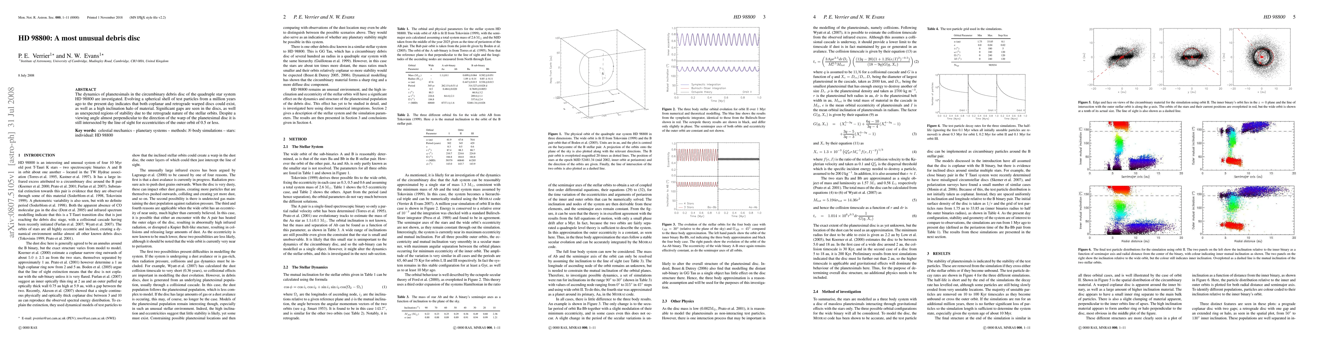 The dynamics of planetesimals in the circumbinary debris disc of the quadruple star system HD 98800 are investigated. Evolving a spherical shell of test particles from a million years ago to the present day indicates that both coplanar and retrograde warped discs could exist, as well as a high inclination halo of material. Significant gaps are seen in the discs, as well as unexpected regions of stability due to the retrograde nature of the stellar orbits. Despite a viewing angle almost perpendicular to the direction of the warp of the planetesimal disc it is still intersected by the line of sight for eccentricities of the outer orbit of 0.5 or less.