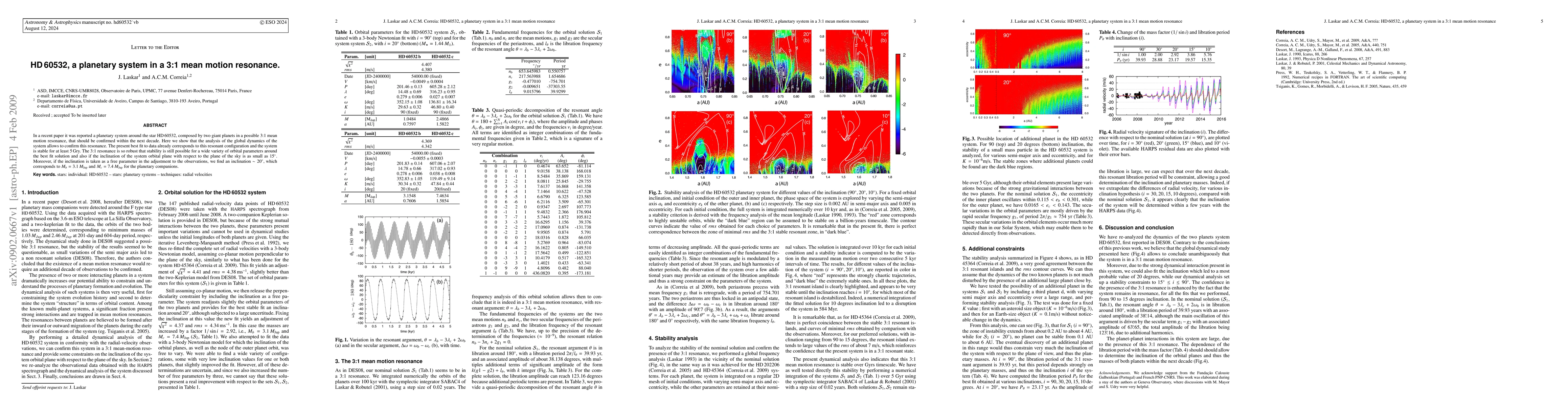 This research confirms the 3:1 mean motion resonance in the planetary system around HD60532, composed of two giant planets, through global dynamic analysis. The system's stability is robust, even with a small inclination of ~20 degrees, suggesting masses of 3.1 M_Jup and 7.4 M_Jup for the planets.