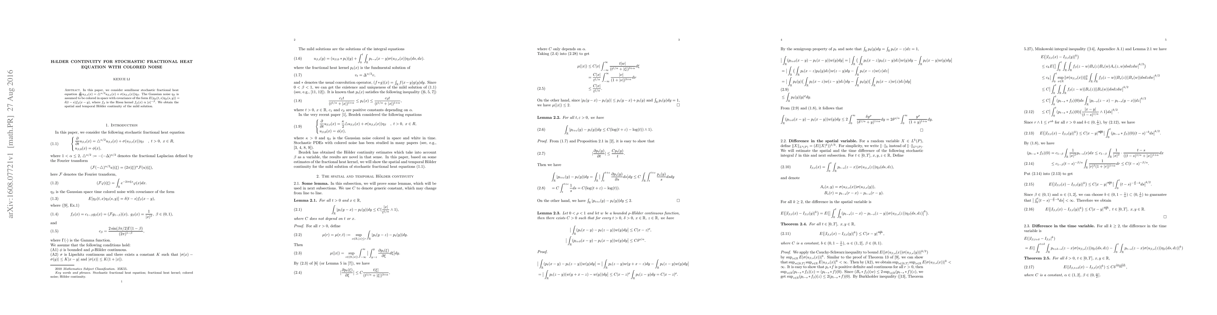 In this paper, we consider semilinear stochastic fractional heat equation $\frac{\partial}{\partial t}u_{\beta,t}(x)=\triangle^{\alpha/2}u_{\beta,t}(x)+\sigma(u_{\beta,t}(x))\eta_{\beta}$. The Gaussian noise $\eta_{\beta}$ is assumed to be colored in space with covariance of the form $E(\eta_{\beta}(t,x)\eta_{\beta}(s,y))=\delta(t-s)f_{\beta}(x-y)$, where $f_{\beta}$ is the Riesz kernel $f_{\beta}(x)\propto |x|^{-\beta}$. We obtain the spatial and temporal H$\ddot{\mbox{o}}$lder continuity of the mild solution.