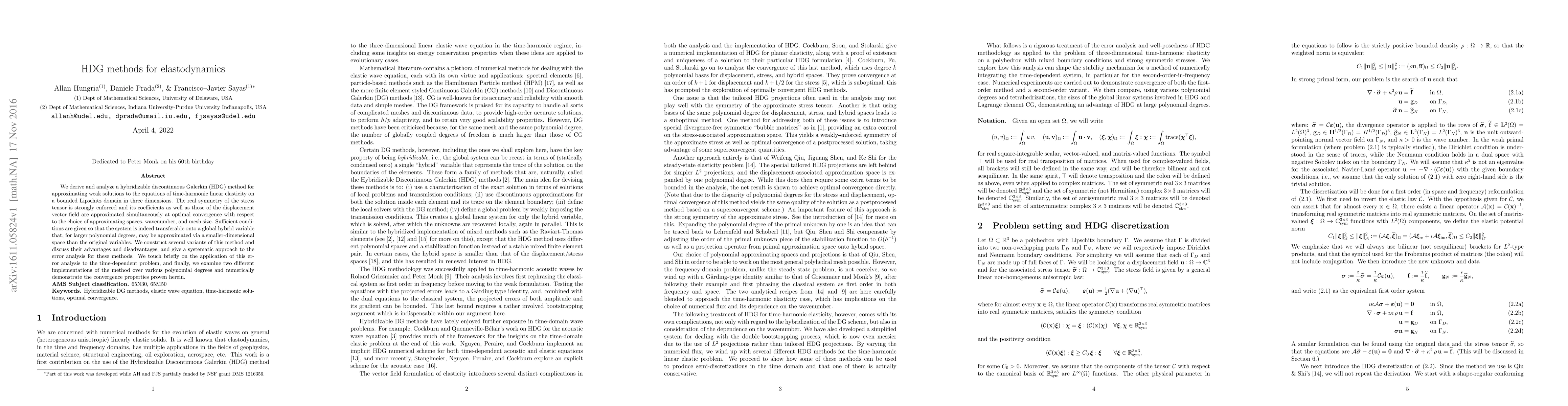 This paper presents a hybridizable discontinuous Galerkin (HDG) method for solving time-harmonic linear elasticity problems in 3D, ensuring symmetry in stress tensor. It analyzes the method's convergence with optimal approximations, introduces global hybrid variable for higher degree polynomials, and discusses various method variants. The error analysis is systematically approached, with brief extensions to time-dependent problems. Numerical demonstrations validate the convergence properties proven.