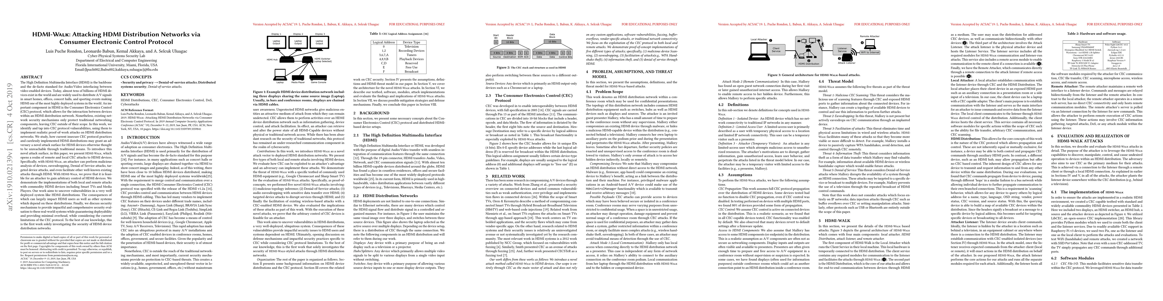 This paper investigates vulnerabilities in the Consumer Electronics Control (CEC) protocol used in HDMI networks, presenting HDMI-Walk, a framework for launching various attacks including device analysis, eavesdropping, and Denial of Service. It demonstrates the feasibility of controlling HDMI devices remotely and locally, and proposes security mechanisms to enhance CEC protocol security with minimal overhead.