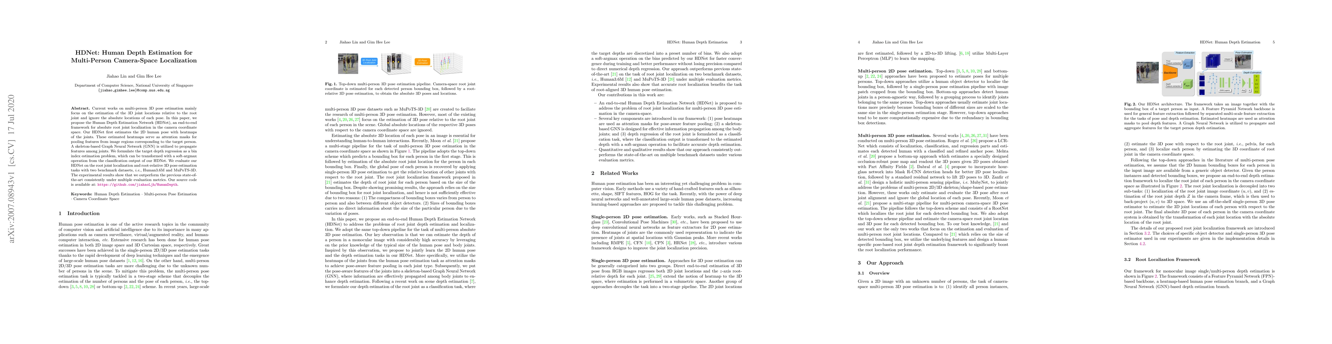 HDNet is an end-to-end framework for estimating the absolute root joint location in camera space, leveraging 2D pose estimation and a Graph Neural Network for feature propagation. It outperforms previous methods on benchmark datasets for root joint localization and 3D pose estimation.