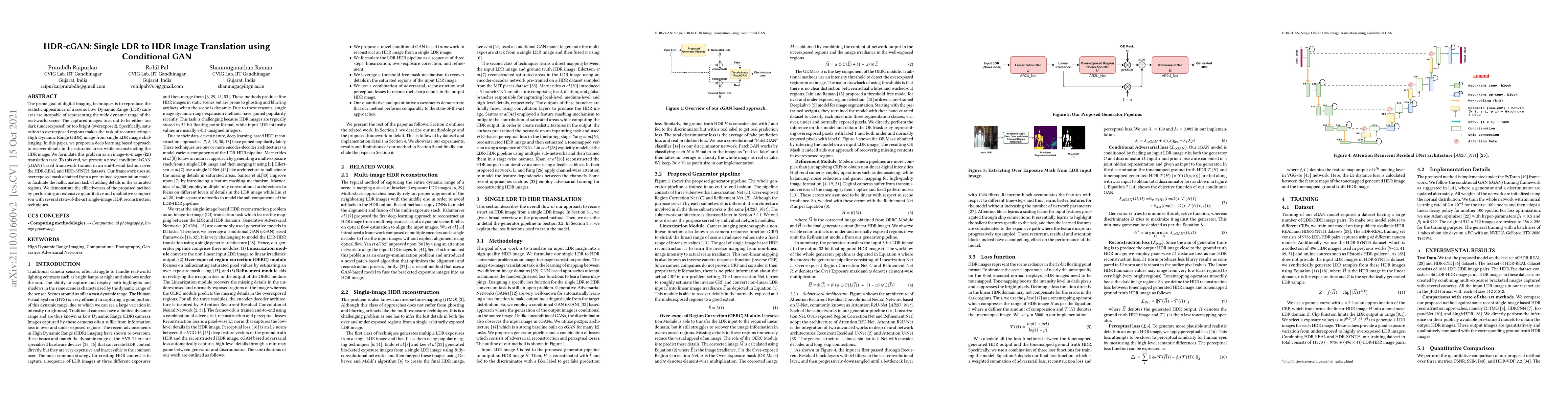 This paper proposes a conditional GAN (cGAN) framework for translating single Low Dynamic Range (LDR) images to High Dynamic Range (HDR) images, addressing the challenge of reconstructing details in overexposed regions. The method uses an overexposed mask and is trained on HDR datasets, showing superior performance compared to other state-of-the-art techniques.