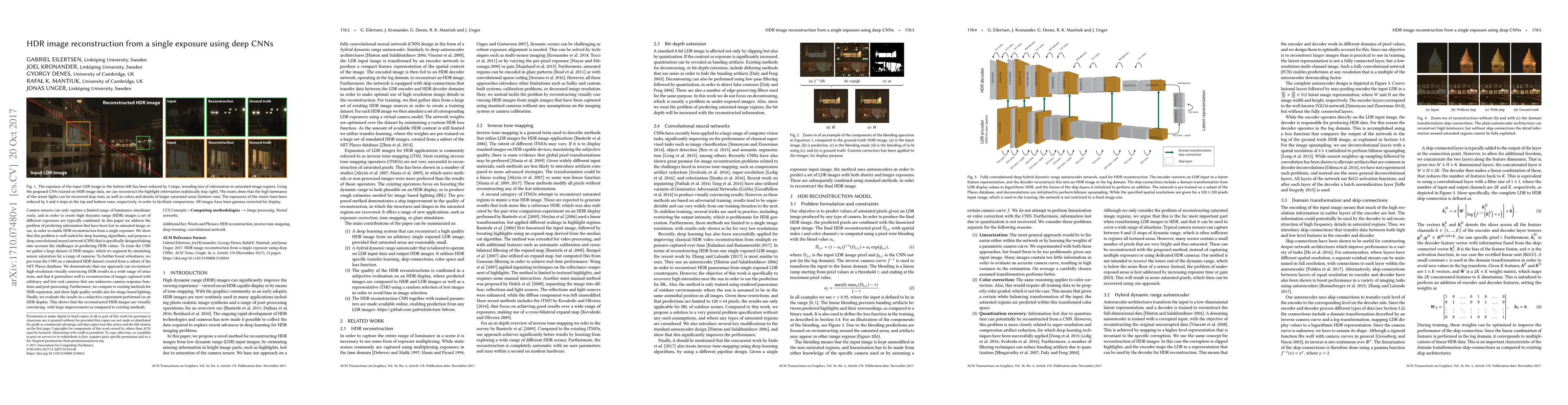 This paper proposes a deep convolutional neural network (CNN) to reconstruct high dynamic range (HDR) images from a single exposure, addressing the challenge of predicting lost information in saturated areas. The CNN is trained on a large dataset augmented with simulated sensor saturation and pre-trained on a simulated HDR dataset, demonstrating high-quality, visually convincing HDR reconstructions across various cameras.
