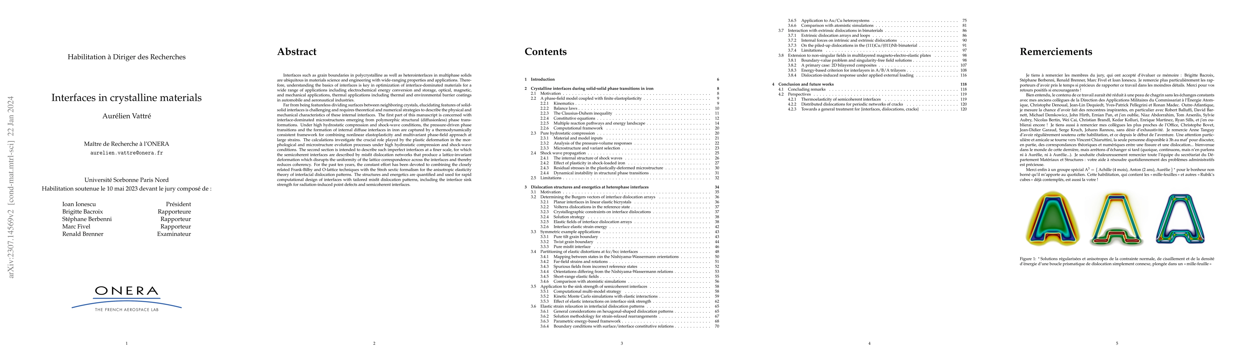 This paper explores the physical and mechanical characteristics of interfaces in crystalline materials, focusing on grain boundaries and heterointerfaces. It investigates interface-dominated microstructures from polymorphic phase transformations under high pressure, employing a thermodynamically consistent framework. The study also delves into semicoherent interfaces and misfit dislocation networks, utilizing advanced theoretical and numerical strategies to design interfaces with tailored properties.
