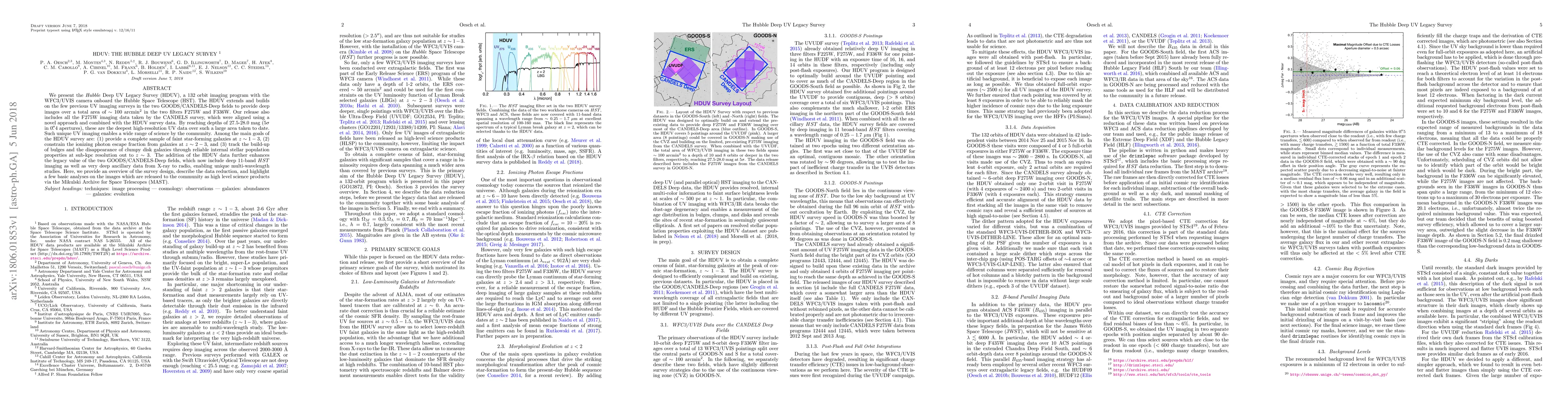 The Hubble Deep UV Legacy Survey (HDUV) offers deep UV imaging over ~100 arcmin² in two filters, providing the deepest high-resolution UV data to date. The survey aims to study faint star-forming galaxies, constrain the ionizing photon escape fraction, and track the evolution of galaxies' stellar populations.