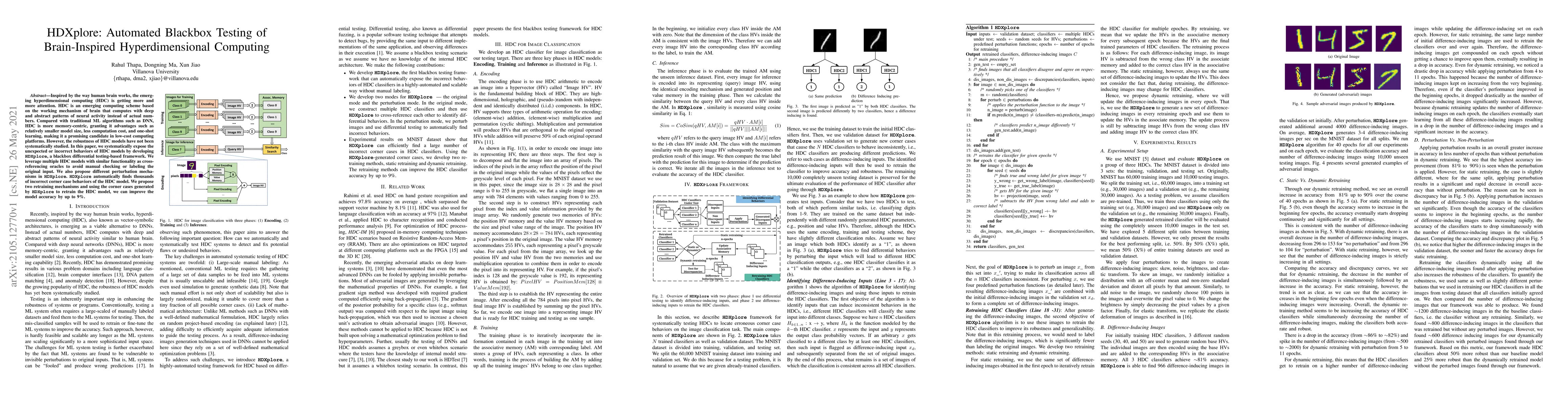 HDXplore is a blackbox testing framework designed to identify unexpected behaviors in hyperdimensional computing (HDC) models, which are inspired by the human brain's neural activity. It improves model robustness by automatically discovering incorrect behaviors and retraining the model, achieving up to a 9% accuracy improvement.