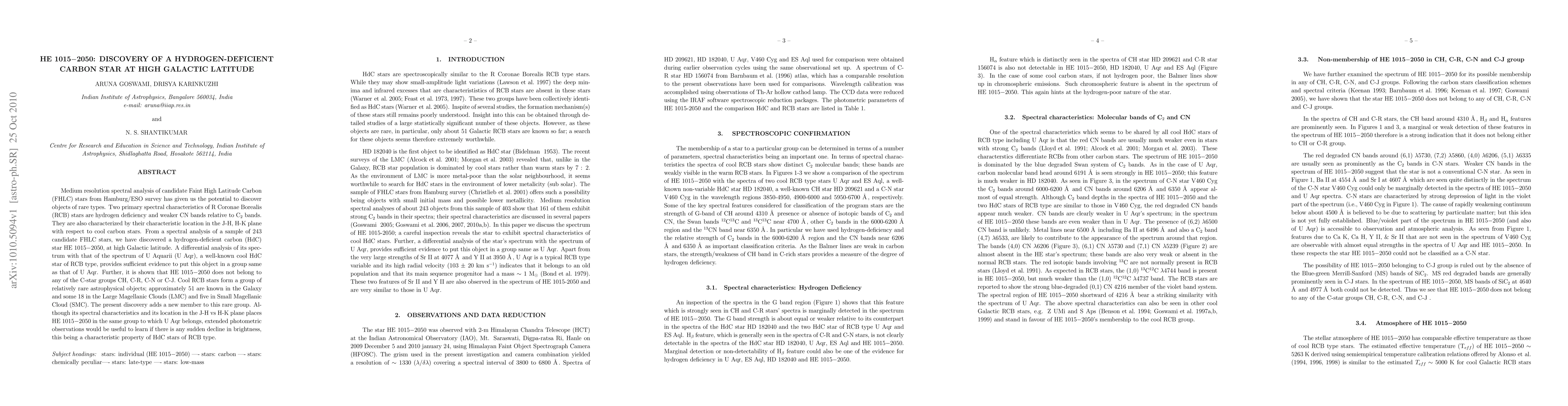 HE 1015-2050 is a newly discovered hydrogen-deficient carbon star at high Galactic latitude, identified through spectral analysis of Faint High Latitude Carbon stars. It shares spectral characteristics with the RCB type, indicating its classification as a rare cool HdC star.