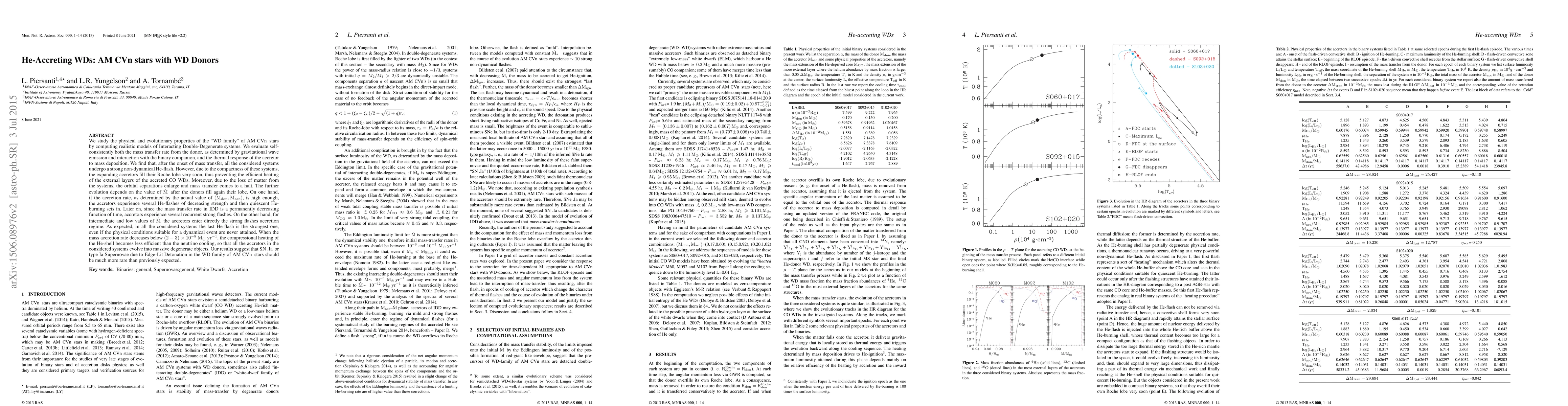 We study the physical and evolutionary properties of the "WD family" of AM CVn stars by computing realistic models of IDD systems. We evaluate self-consistently both the mass transfer rate from the donor, as determined by GW emission and interaction with the binary companion, and the thermal response of the accretor to mass deposition. We find that, after the onset of mass transfer, all the considered systems undergo a strong non-dynamical He-flash. However, due to the compactness of these systems, the expanding accretors fill their Roche lobe very soon, thus preventing the efficient heating of the external layers of the accreted CO WDs. Moreover, due to the loss of matter from the systems, the orbital separations enlarge and mass transfer comes to a halt. The further evolution depends on the value of $\dot{M}$, after the donors fill again their lobe. On one hand, if the accretion rate, as determined by the actual value of (M$_{don}$,M$_{acc}$), is high enough, the accretors experience several He-flashes of decreasing strength and then quiescent He-burning sets in. Later on, since the mass transfer rate in IDD is a permanently decreasing function of time, accretors experience several recurrent strong flashes. On the other hand, for intermediate and low values of $\dot{M}$, the accretors enter the strong flashes accretion regime. As expected, in all the considered systems the last He-flash is the strongest one, even if a dynamical event never occurs. When the mass accretion rate decreases below (2-3)$\times 10^{-8} M_\odot yr^{-1}$, the compressional heating of the He-shell becomes less efficient than the neutrino cooling, so that all the accretors in the considered systems evolve into massive degenerate objects. Our results suggest that SNe .Ia or type Ia Supernovae due to Edge-Lit Detonation in the WD family of AM CVn stars should be much more rare than previously expected.