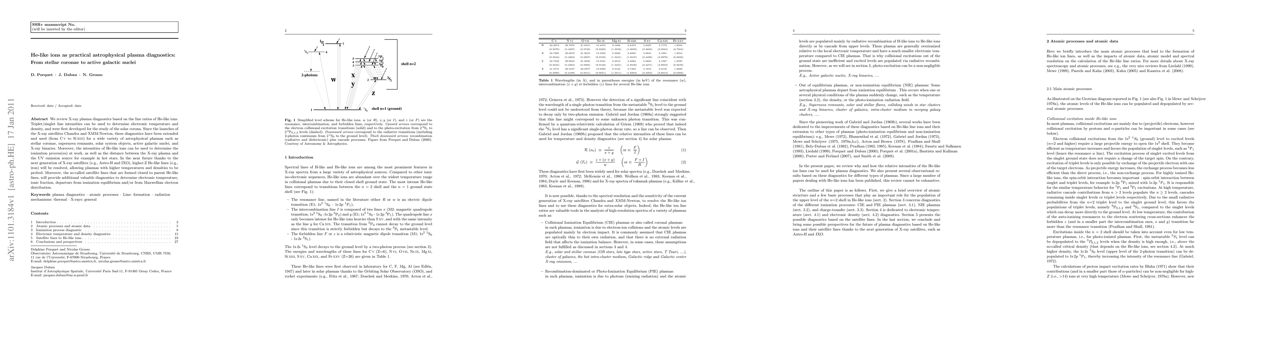 This paper reviews the use of He-like ions' line ratios for X-ray plasma diagnostics, showing how triplet/singlet intensities determine electronic temperature and density across diverse astrophysical plasmas. Future advancements in X-ray satellites will enable the study of higher-temperature and density plasmas, with satellite lines offering additional diagnostics.