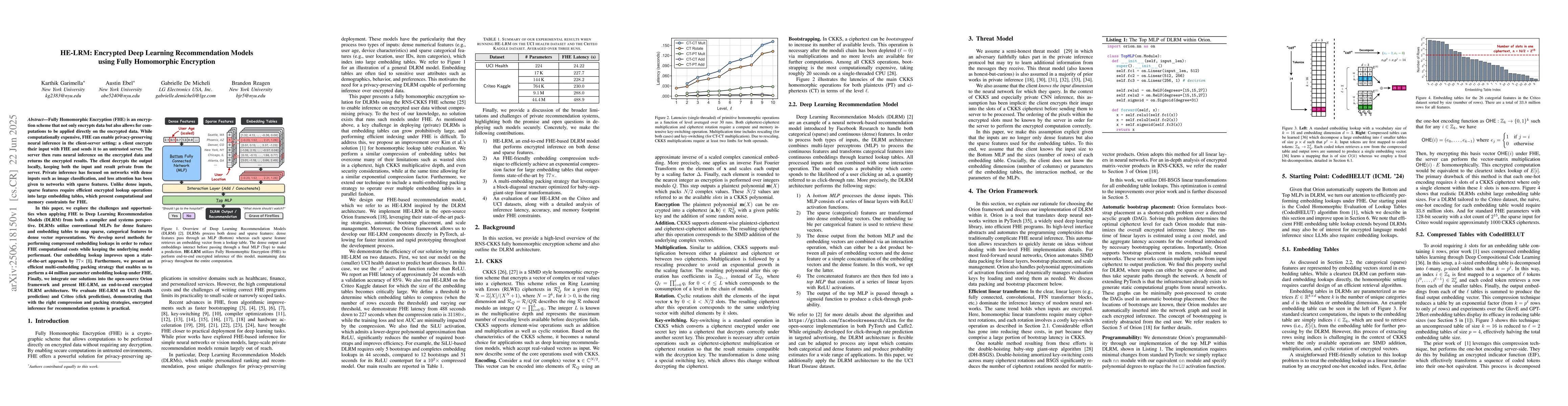 Fully Homomorphic Encryption (FHE) is an encryption scheme that not only encrypts data but also allows for computations to be applied directly on the encrypted data. While computationally expensive, FHE can enable privacy-preserving neural inference in the client-server setting: a client encrypts their input with FHE and sends it to an untrusted server. The server then runs neural inference on the encrypted data and returns the encrypted results. The client decrypts the output locally, keeping both the input and result private from the server. Private inference has focused on networks with dense inputs such as image classification, and less attention has been given to networks with sparse features. Unlike dense inputs, sparse features require efficient encrypted lookup operations into large embedding tables, which present computational and memory constraints for FHE. In this paper, we explore the challenges and opportunities when applying FHE to Deep Learning Recommendation Models (DLRM) from both a compiler and systems perspective. DLRMs utilize conventional MLPs for dense features and embedding tables to map sparse, categorical features to dense vector representations. We develop novel methods for performing compressed embedding lookups in order to reduce FHE computational costs while keeping the underlying model performant. Our embedding lookup improves upon a state-of-the-art approach by $77 \times$. Furthermore, we present an efficient multi-embedding packing strategy that enables us to perform a 44 million parameter embedding lookup under FHE. Finally, we integrate our solutions into the open-source Orion framework and present HE-LRM, an end-to-end encrypted DLRM. We evaluate HE-LRM on UCI (health prediction) and Criteo (click prediction), demonstrating that with the right compression and packing strategies, encrypted inference for recommendation systems is practical.