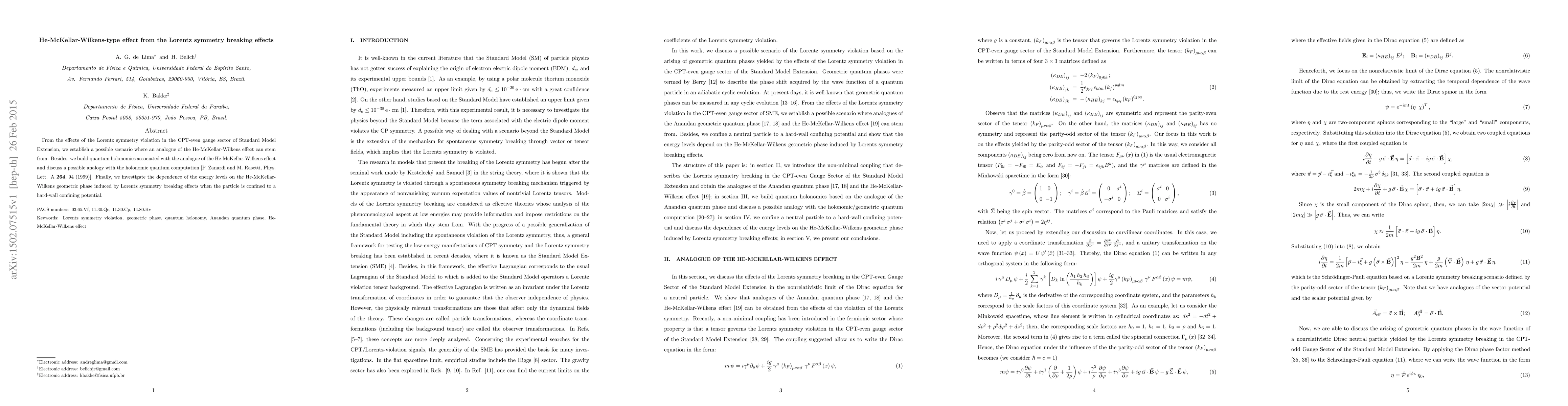 From the effects of the Lorentz symmetry violation in the CPT-even gauge sector of Standard Model Extension, we establish a possible scenario where an analogue of the He-McKellar-Wilkens effect can stem from. Besides, we build quantum holonomies associated with the analogue of the He-McKellar-Wilkens effect and discuss a possible analogy with the holonomic quantum computation [P. Zanardi and M. Rasetti, Phys. Lett. A {\bf264}, 94 (1999)]. Finally, we investigate the dependence of the energy levels on the He-McKellar-Wilkens geometric phase induced by Lorentz symmetry breaking effects when the particle is confined to a hard-wall confining potential.