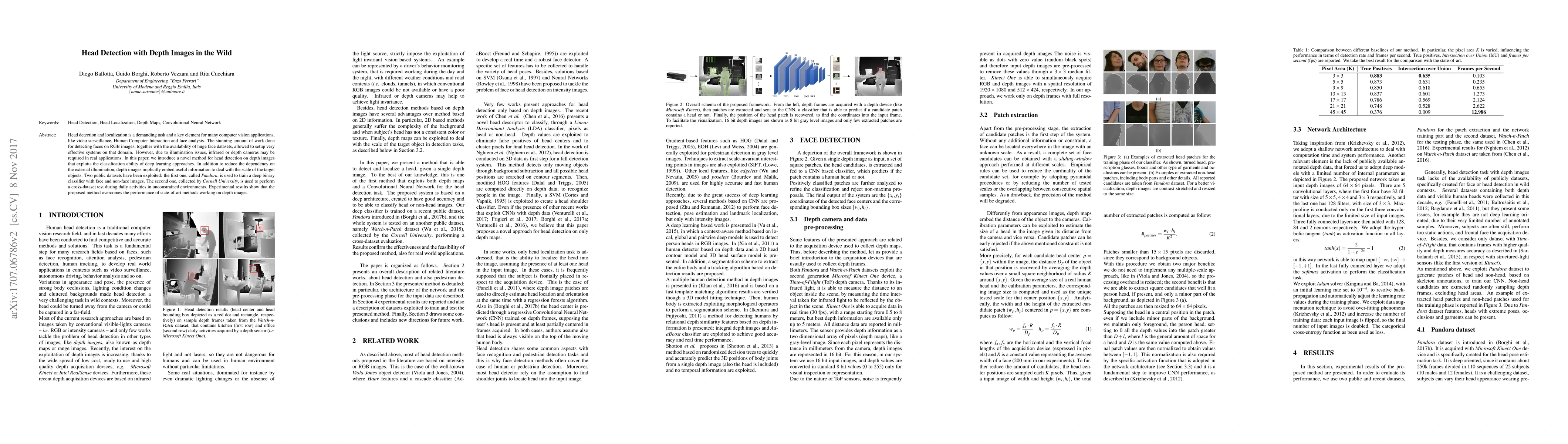 Head detection and localization is a demanding task and a key element for many computer vision applications, like video surveillance, Human Computer Interaction and face analysis. The stunning amount of work done for detecting faces on RGB images, together with the availability of huge face datasets, allowed to setup very effective systems on that domain. However, due to illumination issues, infrared or depth cameras may be required in real applications. In this paper, we introduce a novel method for head detection on depth images that exploits the classification ability of deep learning approaches. In addition to reduce the dependency on the external illumination, depth images implicitly embed useful information to deal with the scale of the target objects. Two public datasets have been exploited: the first one, called Pandora, is used to train a deep binary classifier with face and non-face images. The second one, collected by Cornell University, is used to perform a cross-dataset test during daily activities in unconstrained environments. Experimental results show that the proposed method overcomes the performance of state-of-art methods working on depth images.