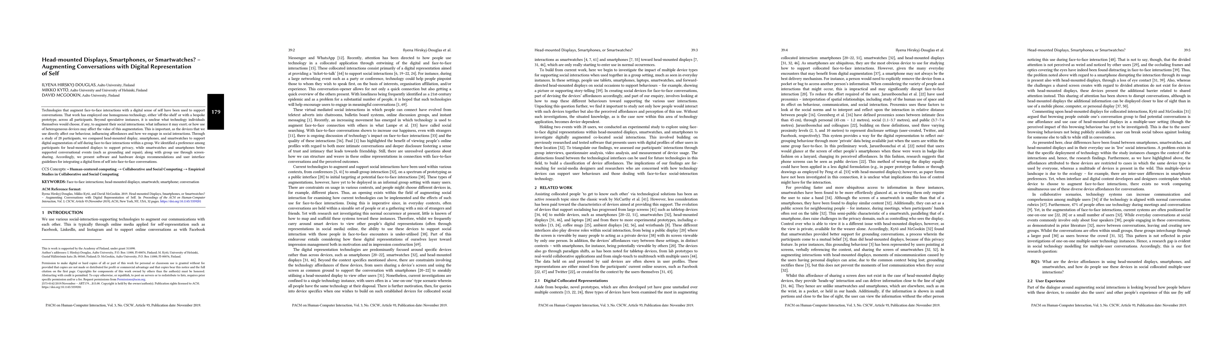 This study investigates preferences among head-mounted displays, smartphones, and smartwatches for augmenting face-to-face interactions with a digital sense of self. Results show a preference for head-mounted displays for privacy, while smartwatches and smartphones better support conversational events and group use.
