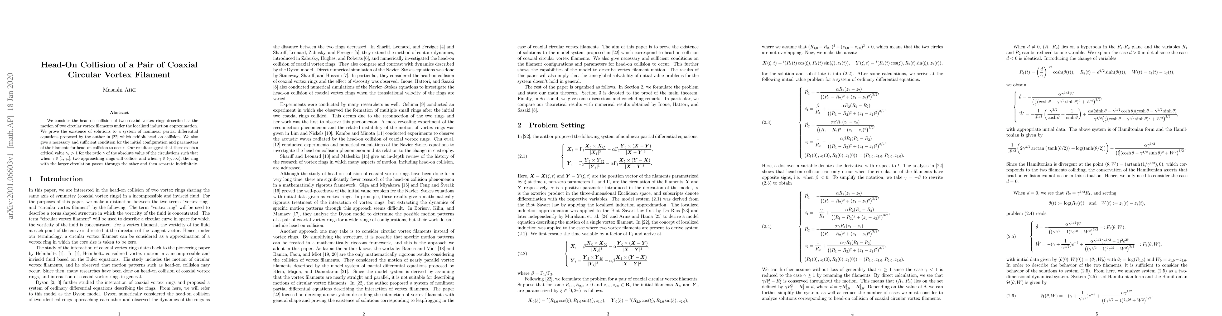 We consider the head-on collision of two coaxial vortex rings described as the motion of two circular vortex filaments under the localized induction approximation. We prove the existence of solutions to a system of nonlinear partial differential equations proposed by the author which exhibit head--on collision. We also give a necessary and sufficient condition for the initial configuration and parameters of the filaments for head-on collision to occur. Our results suggest that there exists a critical value $ \gamma_{\ast}>1 $ for the ratio $ \gamma $ of the absolute value of the circulations such that when $ \gamma\in [1,\gamma_{\ast}]$, two approaching rings will collide, and when $ \gamma \in (\gamma_{\ast},\infty) $, the ring with the larger circulation passes through the other and then separate indefinitely.