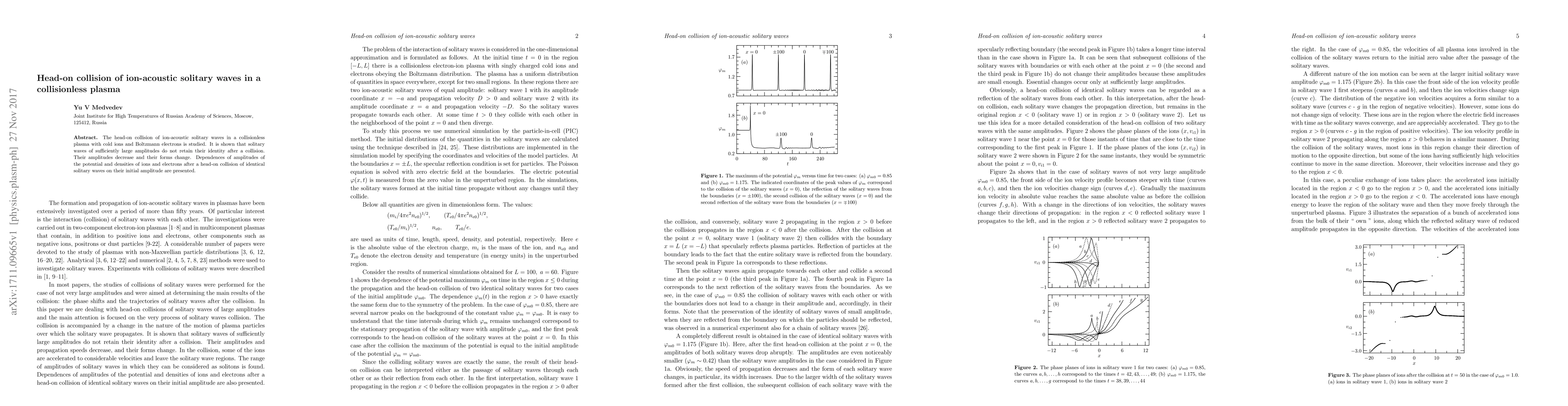 Summary: This study investigates head-on collisions of ion-acoustic solitary waves in a collisionless plasma, demonstrating that high-amplitude waves lose their identity post-collision, experiencing amplitude reductions and form alterations. Initial amplitude dependencies of resultant potential and ion/electron densities are analyzed.