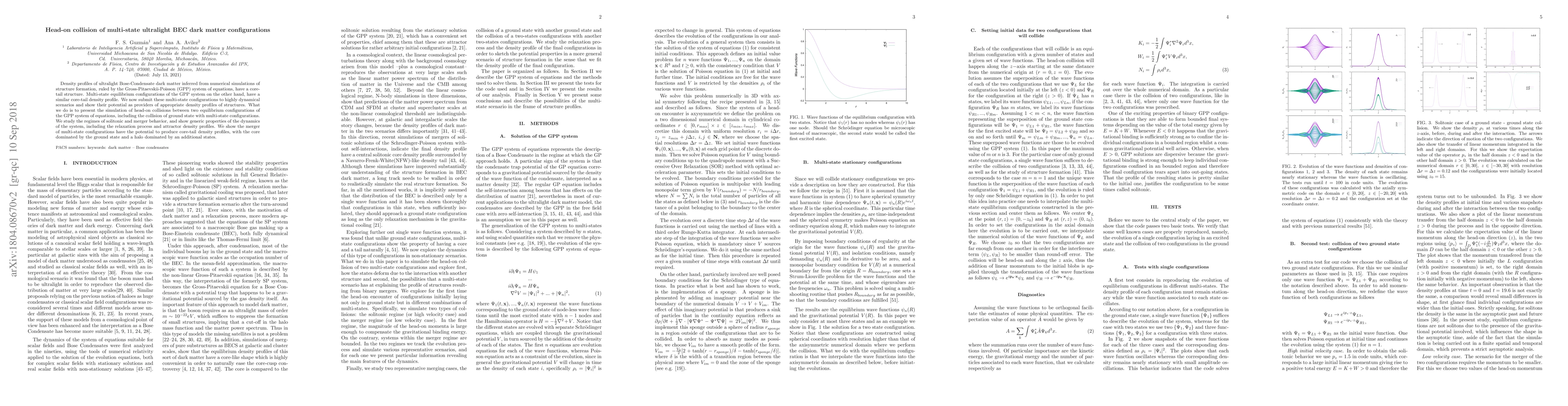 Researchers simulate head-on collisions between ultralight dark matter configurations, finding that they can produce core-tail density profiles with a central component dominated by the ground state and a halo made up of additional states.