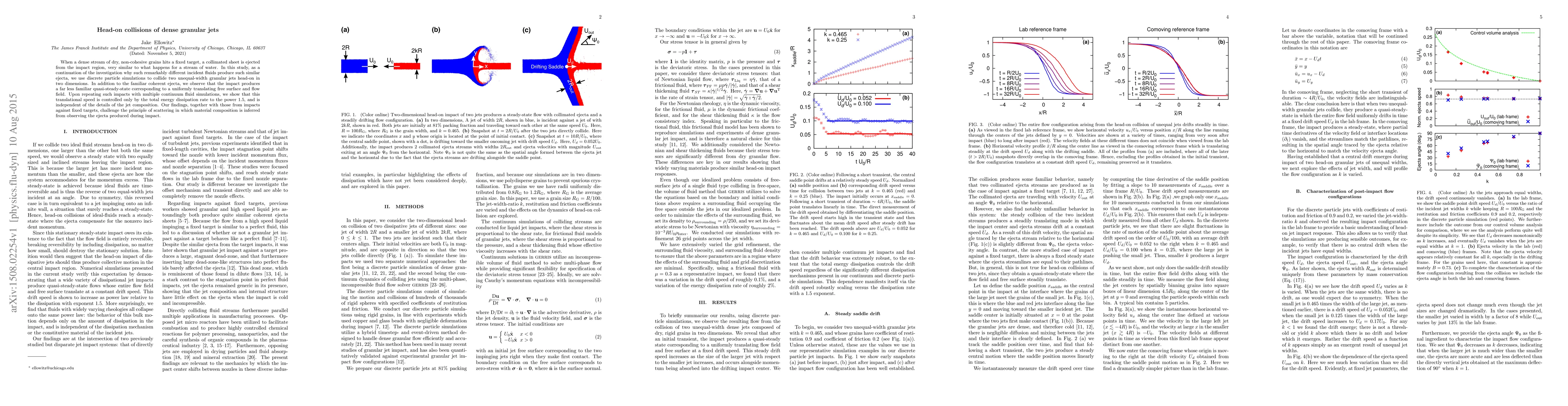 This study investigates head-on collisions of dense granular jets using discrete particle simulations, revealing a quasi-steady-state flow and a translational speed dependent on energy dissipation. Findings challenge the principle of scattering, suggesting ejecta behavior does not solely depend on material composition.