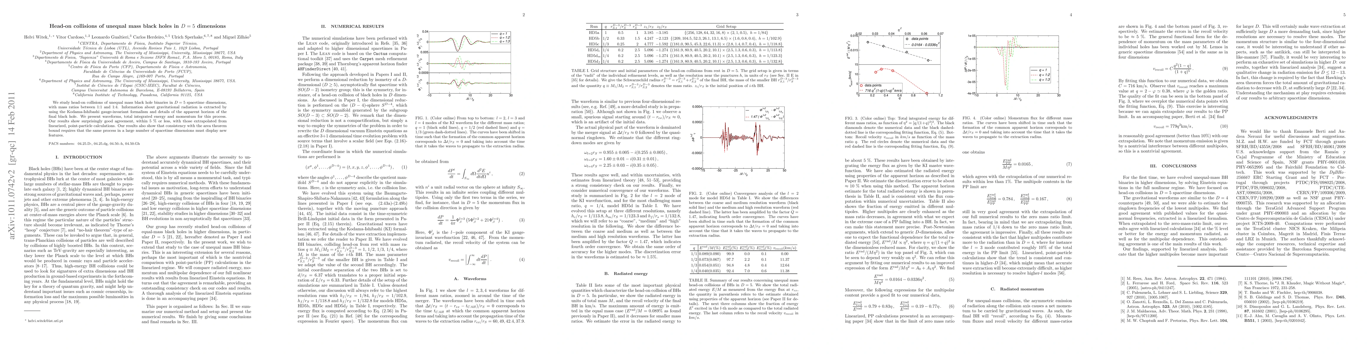 We study head-on collisions of unequal mass black hole binaries in D=5 space-time dimensions, with mass ratios between 1:1 and 1:4. Information about gravitational radiation is extracted by using the Kodama-Ishibashi gauge-invariant formalism and details of the apparent horizon of the final black hole. For the first time, we present waveforms, total integrated energy and momentum for this process. Our results show surprisingly good agreement, within 5% or less, with those extrapolated from linearized, point-particle calculations. Our results also show that consistency with the area theorem bound requires that the same process in a large number of spacetime dimensions must display new features.