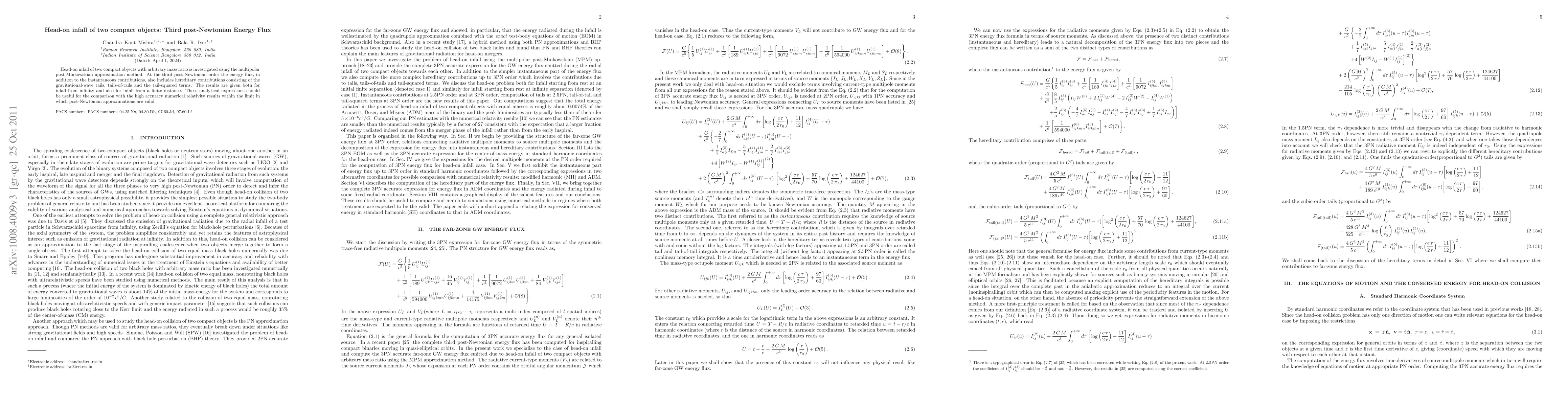 This paper investigates the head-on infall of two compact objects using the third post-Newtonian approximation, including hereditary contributions from gravitational-wave tails. Analytical expressions for energy flux are provided for both infinite and finite initial distances, aiding comparisons with numerical relativity results.