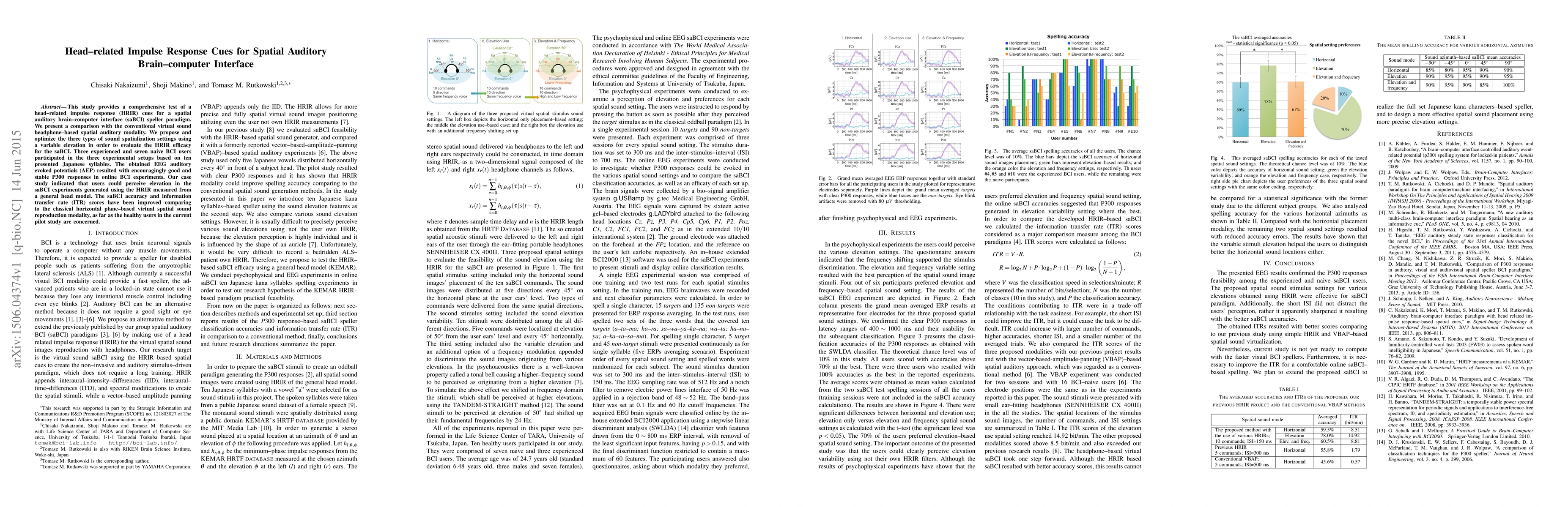 This study provides a comprehensive test of a head-related impulse response (HRIR) cues for a spatial auditory brain-computer interface (saBCI) speller paradigm. We present a comparison with the conventional virtual sound headphone-based spatial auditory modality. We propose and optimize the three types of sound spatialization settings using a variable elevation in order to evaluate the HRIR efficacy for the saBCI. Three experienced and seven naive BCI users participated in the three experimental setups based on ten presented Japanese syllables. The obtained EEG auditory evoked potentials (AEP) resulted with encouragingly good and stable P300 responses in online BCI experiments. Our case study indicated that users could perceive elevation in the saBCI experiments generated using the HRIR measured from a general head model. The saBCI accuracy and information transfer rate (ITR) scores have been improved comparing to the classical horizontal plane-based virtual spatial sound reproduction modality, as far as the healthy users in the current pilot study are concerned.