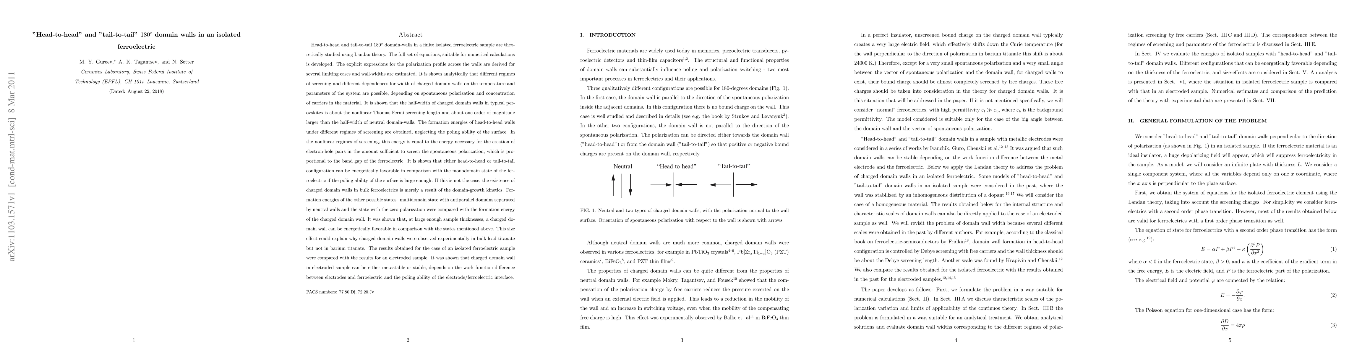This paper theoretically investigates "head-to-head" and "tail-to-tail" 180-degree domain walls in isolated ferroelectrics using Landau theory, deriving equations for numerical calculations and polarization profiles. The study reveals different screening regimes and wall-width dependencies on temperature and system parameters, showing that charged domain walls can be energetically favorable under certain conditions.