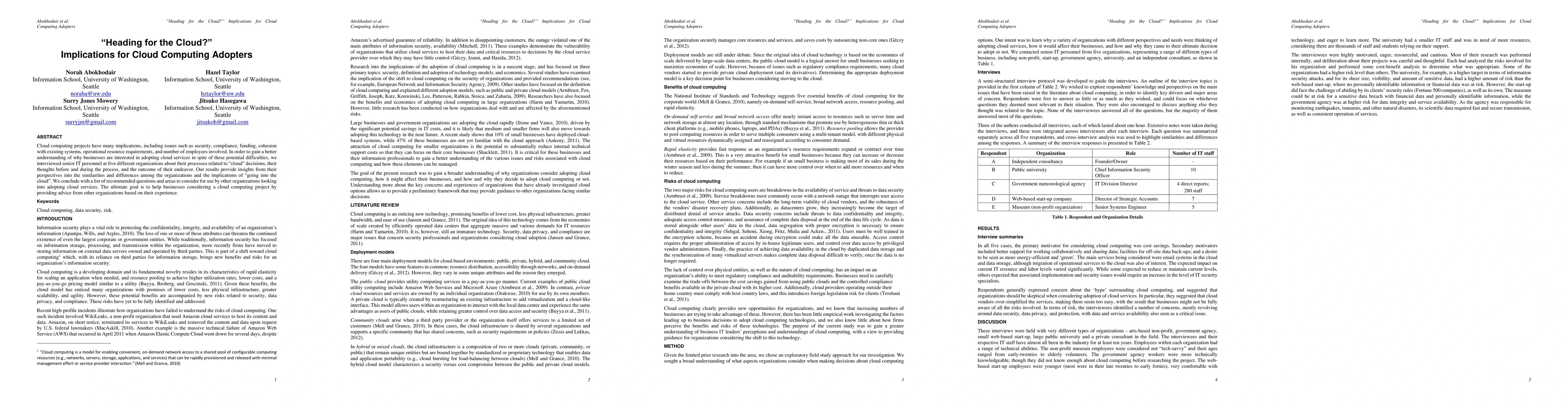 Cloud computing projects have many implications, including issues such as security, compliance, funding, cohesion with existing systems, operational resource requirements, and number of employees involved. In order to gain a better understanding of why businesses are interested in adopting cloud services in spite of these potential difficulties, we interviewed senior IT personnel at five different organizations about their processes related to cloud decisions, their thoughts before and during the process, and the outcome of their endeavor. Our results provide insights from their perspectives into the similarities and differences among the organizations and the implications of going into the cloud. We conclude with a list of recommended questions and areas to consider for use by other organizations looking into adopting cloud services. The ultimate goal is to help businesses considering a cloud computing project by providing advice from other organizations based on their experience.
