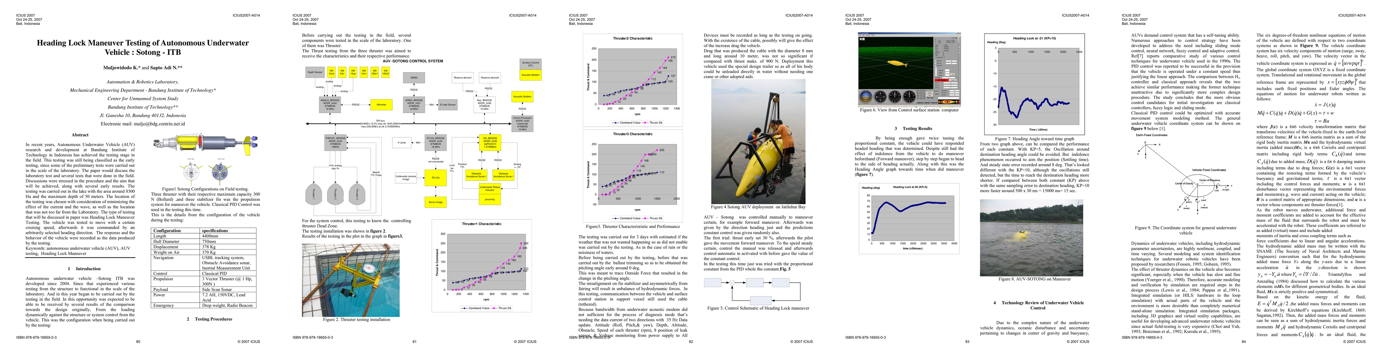 In recent years, Autonomous Underwater Vehicle (UAV) research and development at Bandung Institute of Technology in Indonesia has achieved the testing stage in the field. This testing was still being classified as the early testing, since some of the preliminary tests were carried out in the scale of the laboratory. The paper would discuss the laboratory test and several tests that were done in the field. Discussions were stressed in the procedure and the aim that will be achieved, along with several early results. The testing was carried out in the lake with the area around 8300 Ha and the maximum depth of 50 meters. The location of the testing was chosen with consideration of minimizing the effect of the current and the wave, as well as the location that was not too far from the Laboratory. The type of testing that will be discussed in paper was Heading Lock Maneuver Testing. The vehicle was tested to move with a certain cruising speed, afterwards it was commanded by an arbitrarily selected heading direction. The response and the behavior of the vehicle were recorded as the data produced by the testing.